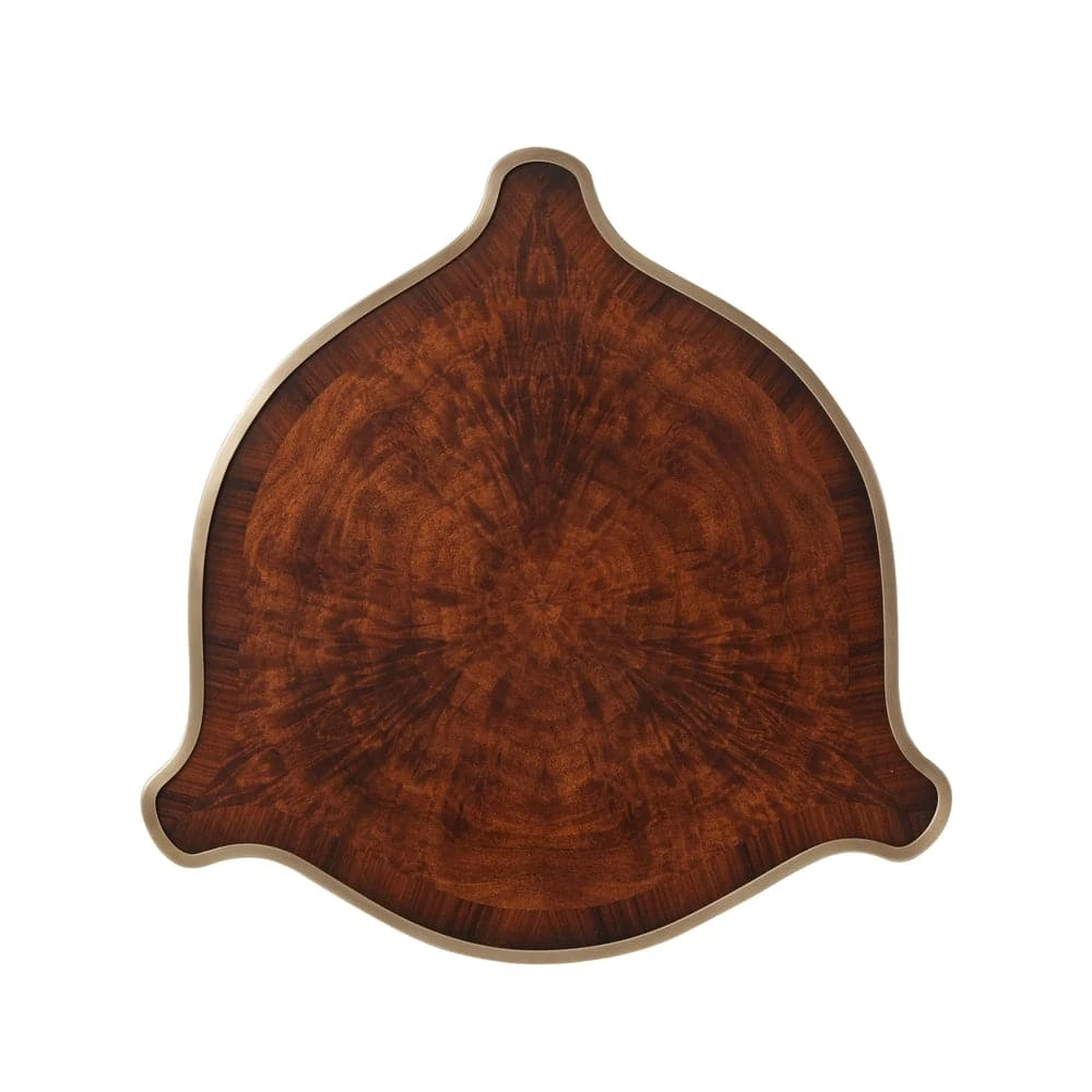 A mahogany and ormolu mounted occasional table, the brass bound shaped circular top above a Morado veneered frieze enclosed by foliate mounts, on three cabriole legs with caryatid mounts terminating in sabots, united by a shaped undertier.