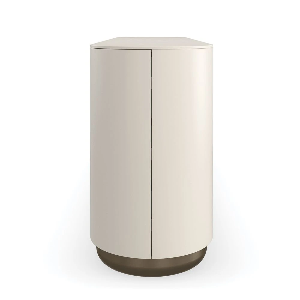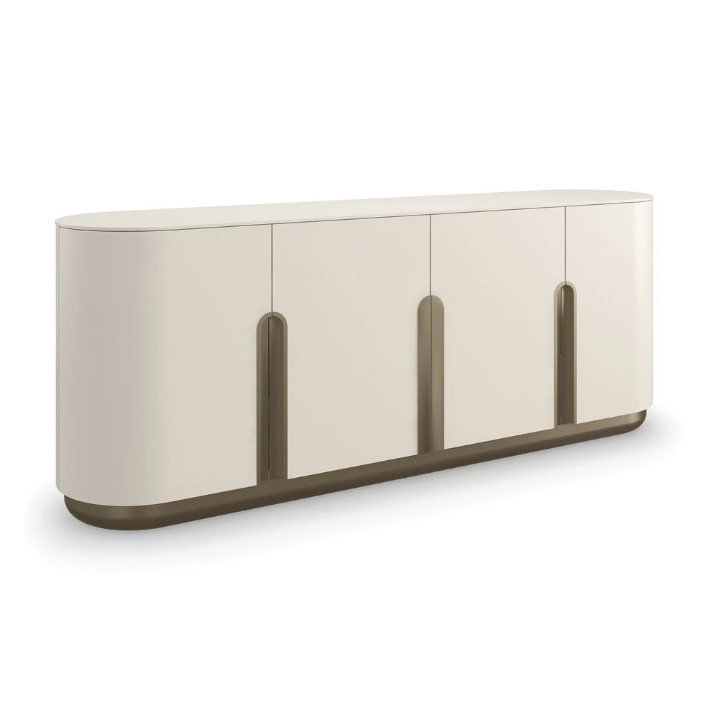 With a series of arches formed by its Lucent Bronze hardware, this tactile design recalls the whitewashed architecture seen along the Moroccan coast. Balanced on a metallic plinth base, its clean lines and gently rounded edges lend a versatile style to dining interiors, as well as media rooms and home offices. Features a chic painted interior with two center drawers and open storage with adjustable shelves for added function and organization.