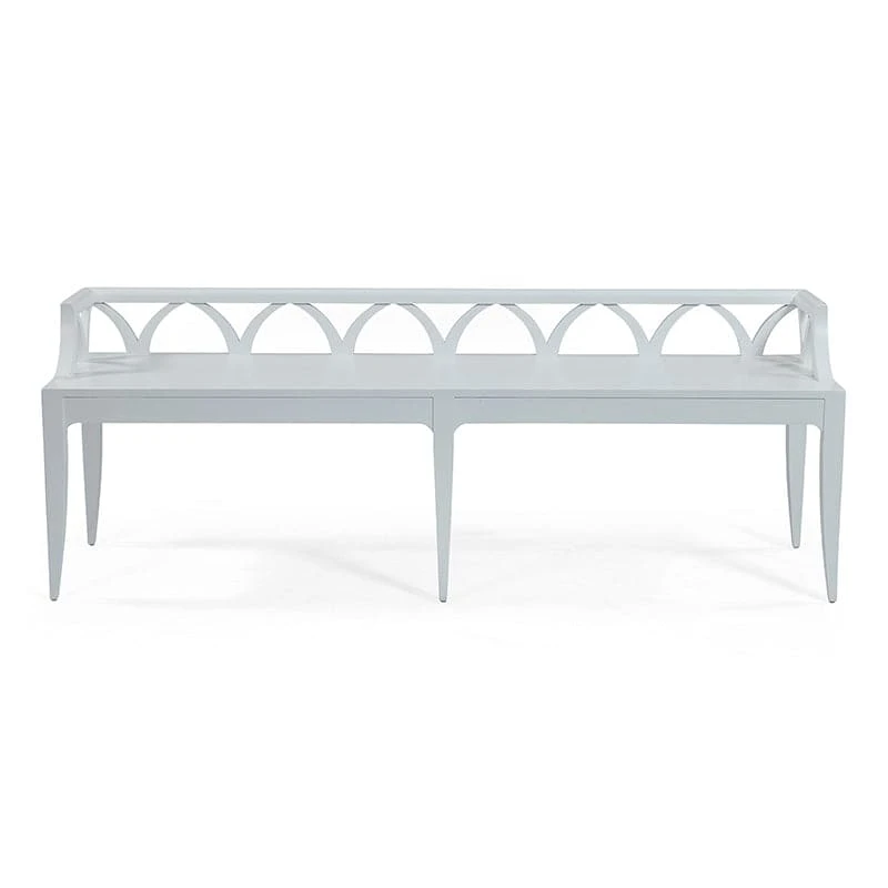 A delightful entryway or dining bench with a colonnade of wooden arches above a wood seat that is elevated on gracefully tapering legs.
