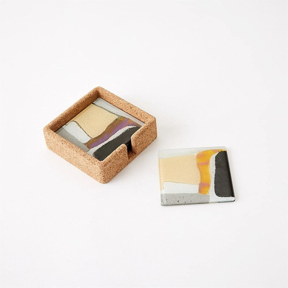 The Cashmere Glass Collection is a testament to the intricate artistry of Portuguese artisans. The process begins with a flat piece of clear glass, which is carefully cut into the shape it will become. The number of colors in the collection determines the number of templates used to layer the sand onto the glass. Artisans start by placing the first template onto the glass and sifting sand through it to fill the template with a specific color. With precision, the template is then lifted and removed. Another template is placed onto the clear glass to sift a different color of sand, creating the next shape. This process is repeated until the flat glass is nearly covered with different colors of sand. Next, artisans lay a clean piece of clear glass on top, creating a sandwich, and carefully transport it to the kiln where it rests upon the shape it will become. In the kiln, it undergoes baking at an incredibly high temperature, fusing the two layers of glass together to create exquisite abstract designs. Plate stands are sold separately from chargers.