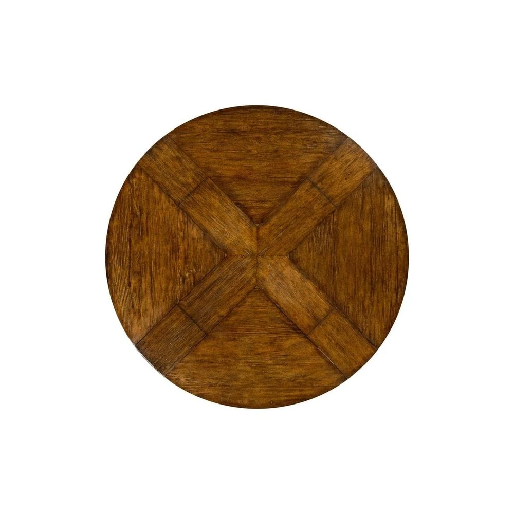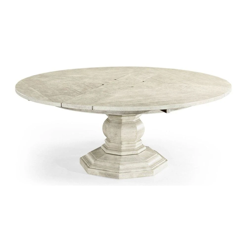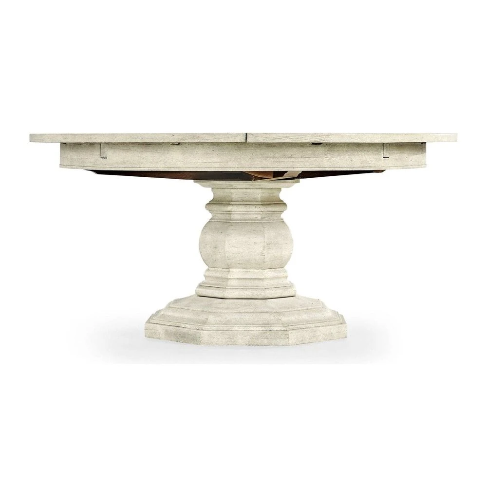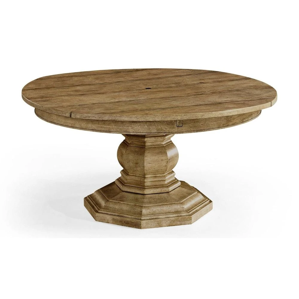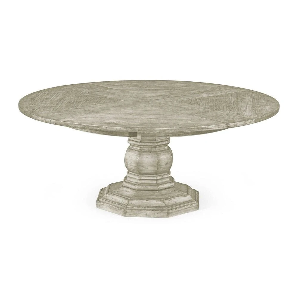 59″ antique dark grey, country walnut, medium driftwood, whitewash driftwood, dark ale, rustic grey topped circular dining table with a rustic finish showing exposed saw marks set on a substantial baluster stem base, the table extending via an ingenious mechanism of self-storing hinged fold-out leaves within.