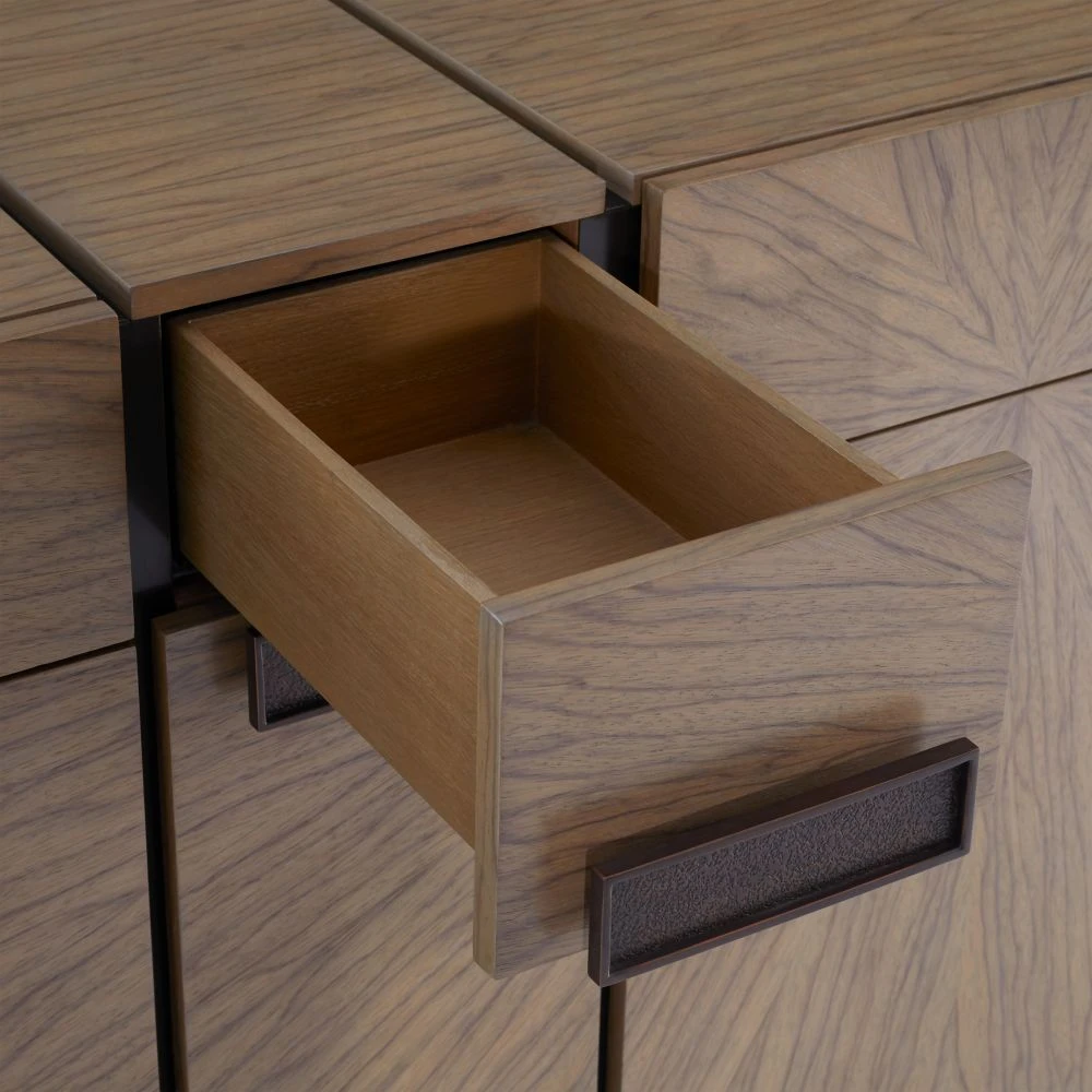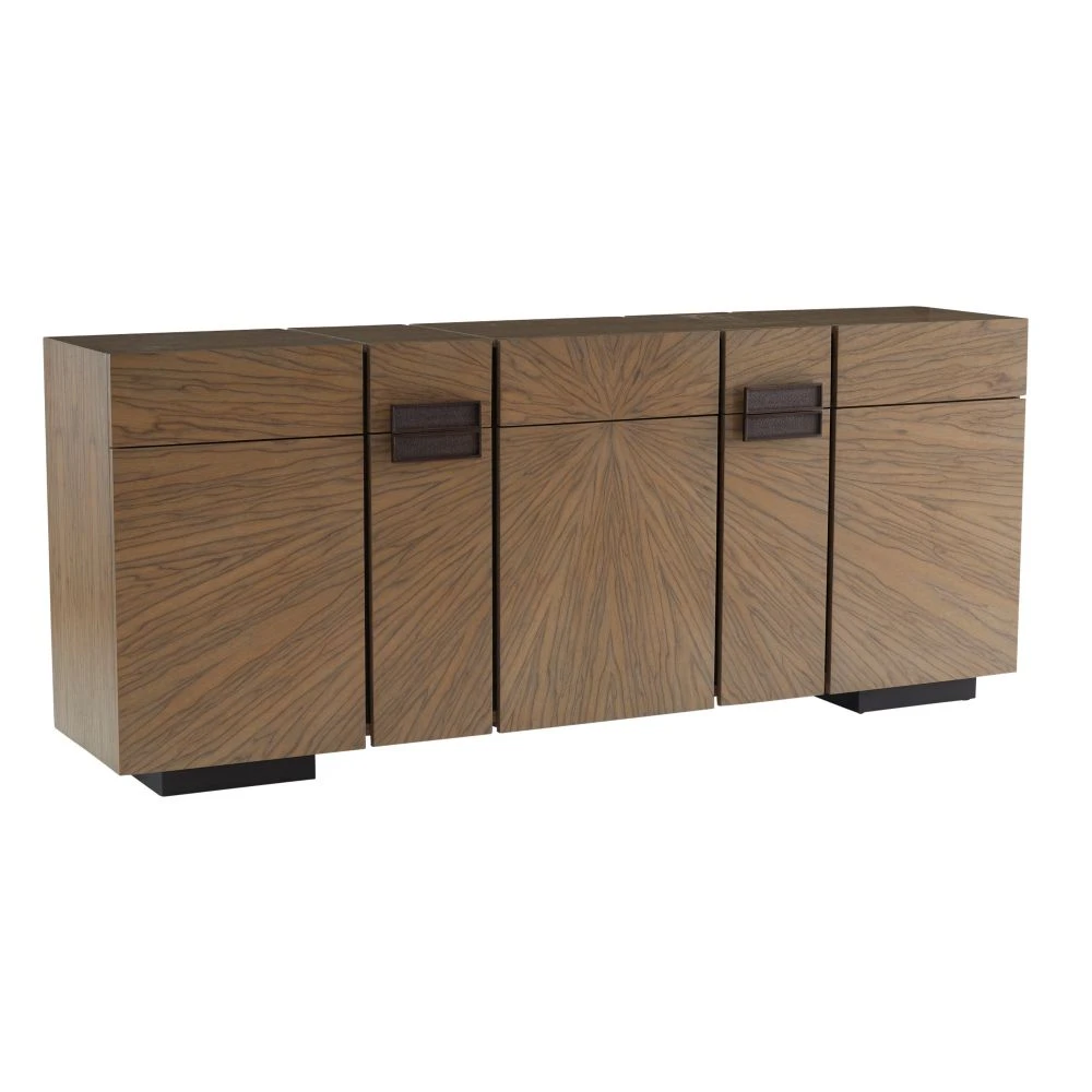 The Lafayette credenza brings interest and charm with an unexpected silhouette. Figural ofram veneer in chateau gray creates a dynamic sunburst pattern on the cabinet face, met by an opposing horizontal pattern on the top. Integrated textural hardware of bronze brass creates a focal point to tie this striking piece together. A metal parting rail wraps around the case, while inside each cabinet space is a single removable shelf. Finish will vary.