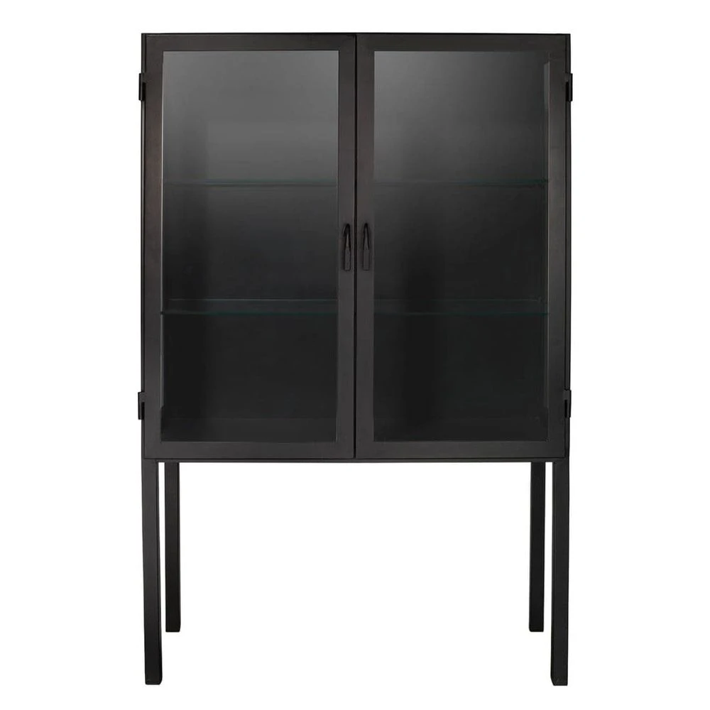 Glass panes are encased in simple black metal to create a wide, minimalistic cabinet perfect for storage or display. Use this piece to showcase your favorite barware or books.