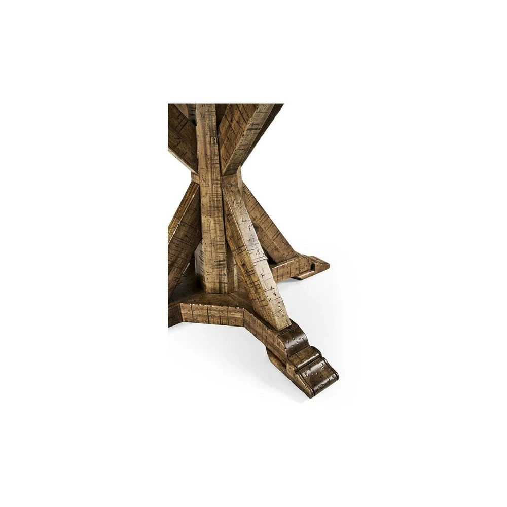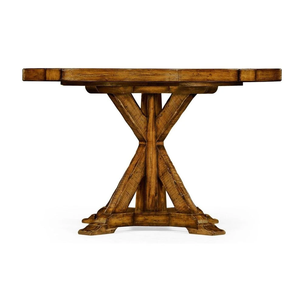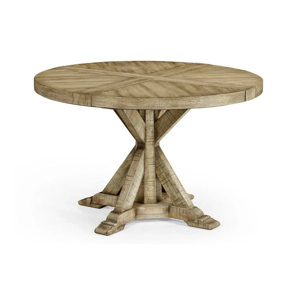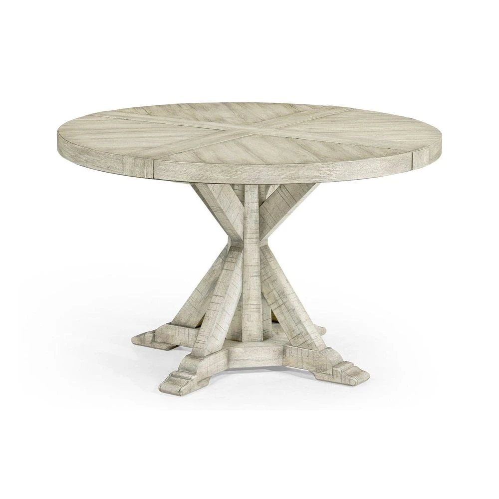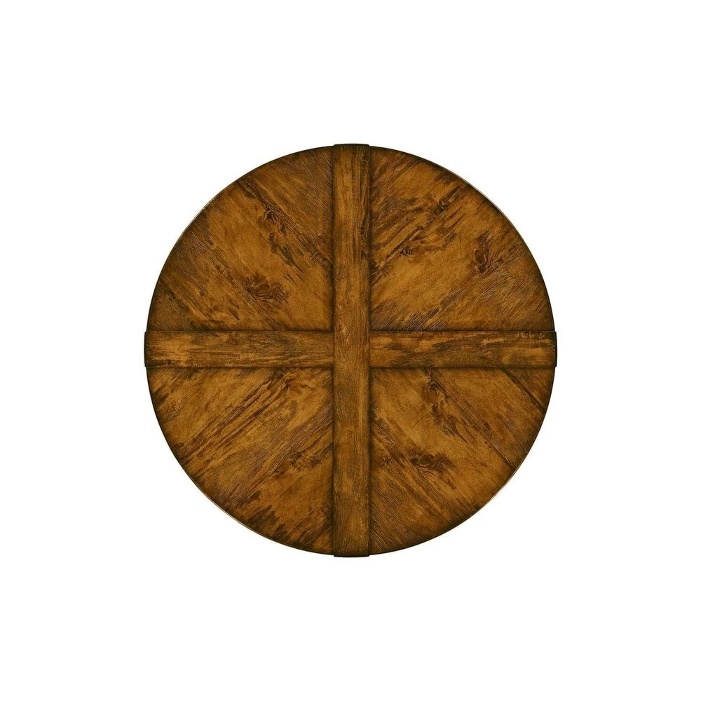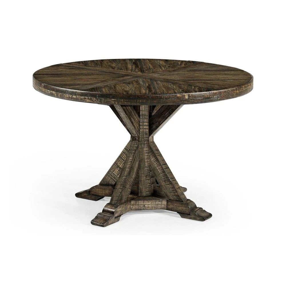 Solid antique dark grey, country walnut, dark driftwood, light driftwood, medium driftwood, whitewash driftwood, dark ale, rustic grey topped circular dining table with a rustic finish showing exposed saw marks and set on a bracketed country living base. 60″ & 72″ table containing an ingenious mechanism of a self-storing lazy susan within.