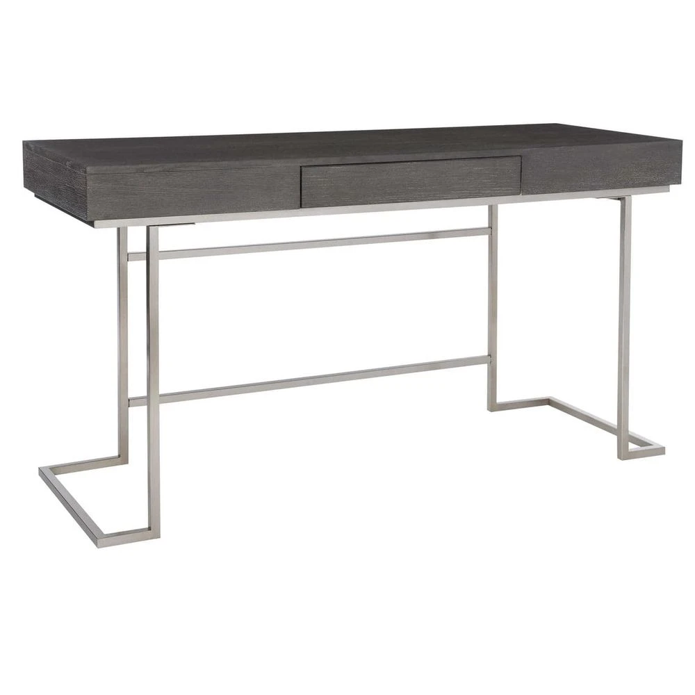 Outfit your office with this clean-lined contemporary desk, featuring an oak veneer top finished in a smoke gray with a subtle light gray wash, atop a stainless steel base finished in a plated brushed nickel. Has a touch latch keyboard drawer that flips down for optimal storage.