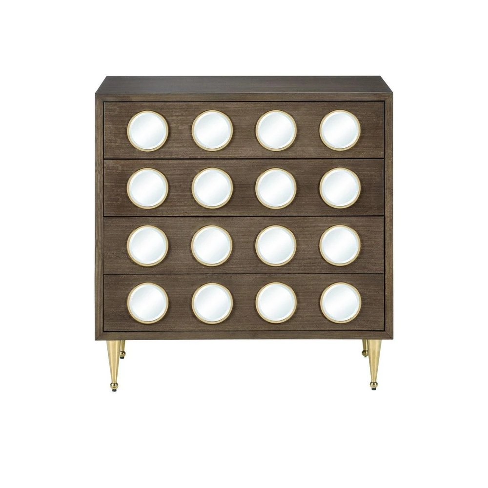Description: The Colette Chest is made of poplar wood that is covered in Eucalyptus veneers with a beautiful linear texture to them, heightened when finished in a tawny brown. Elevating the sophistication of the four-drawer chest is a high-gloss luster on the exterior. The luminous beveled mirror accents, which sit proud on the surface of the chest, are surrounded by stainless steel rings in a polished brass finish that to the legs.