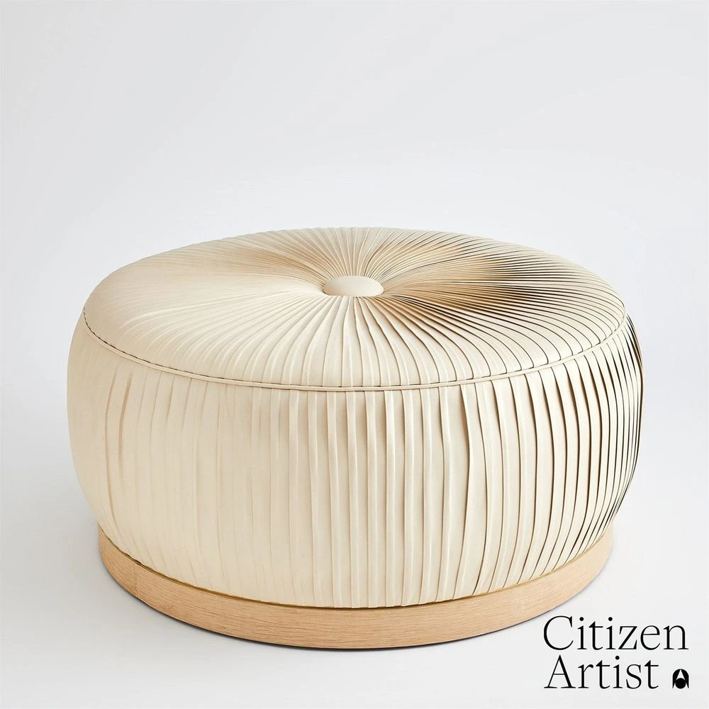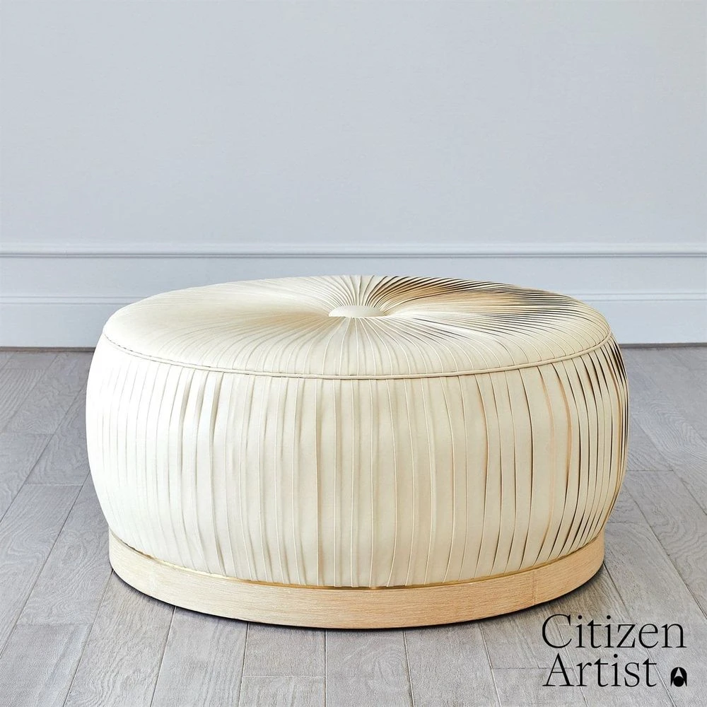 Tailored glamour is what sets the Colette ottoman apart from her contemporaries. Pleated ivory leather envelops the upholstered drum atop a warm, white oak base with inset bronze reveal. Her every detail is considered.