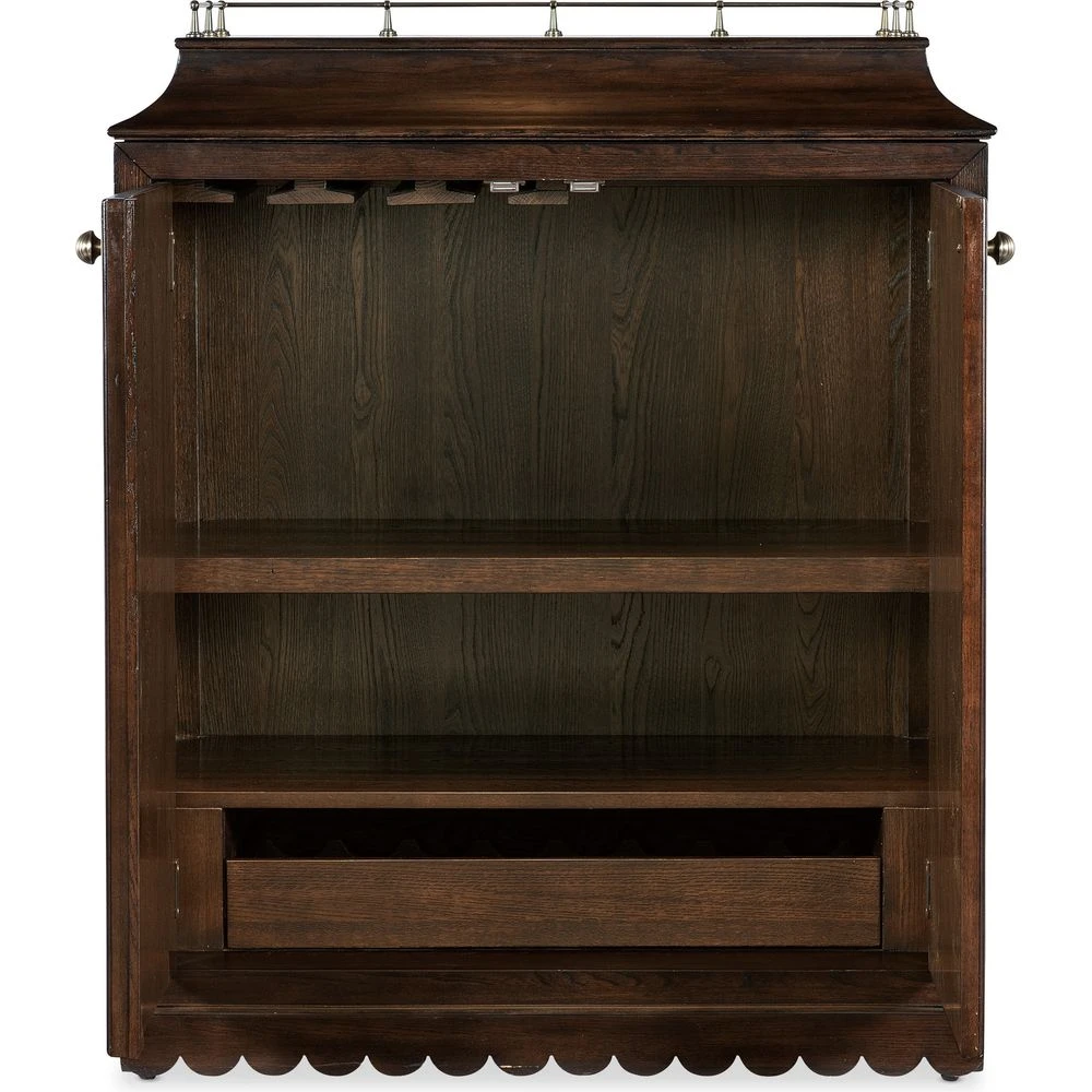 Description: In a classic and classy silhouette, the Dukes Bar Cabinet is functional and chic. Crafted of Elm Veneers with a rich dark finish, it has a gold metal gallery back on the top, two doors with magnetic catches and a scalloped apron around the bottom. Behind the doors are three wine glass racks, one adjustable wood shelf and an open storage area. There’s a pullout drawer for bottle storage that holds up to 8 bottles, and a hidden top drawer with finger pulls and removable black felt liner.