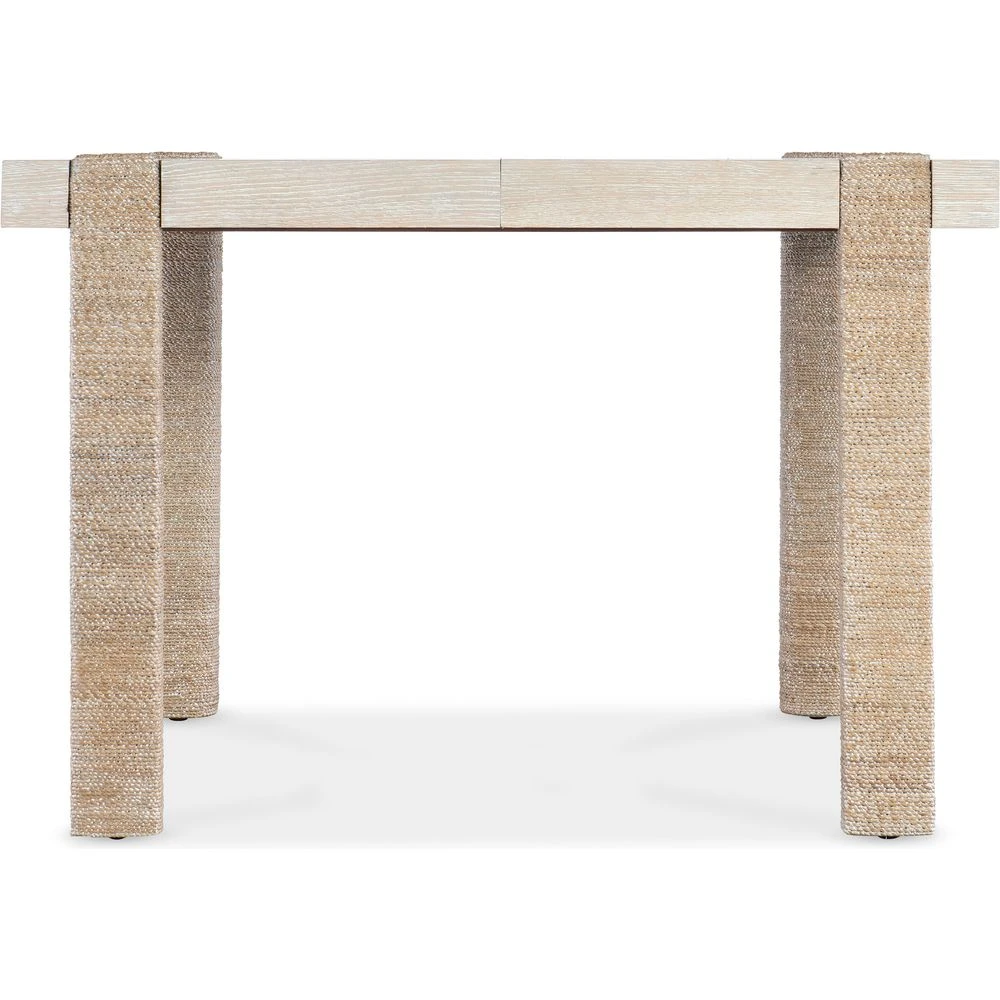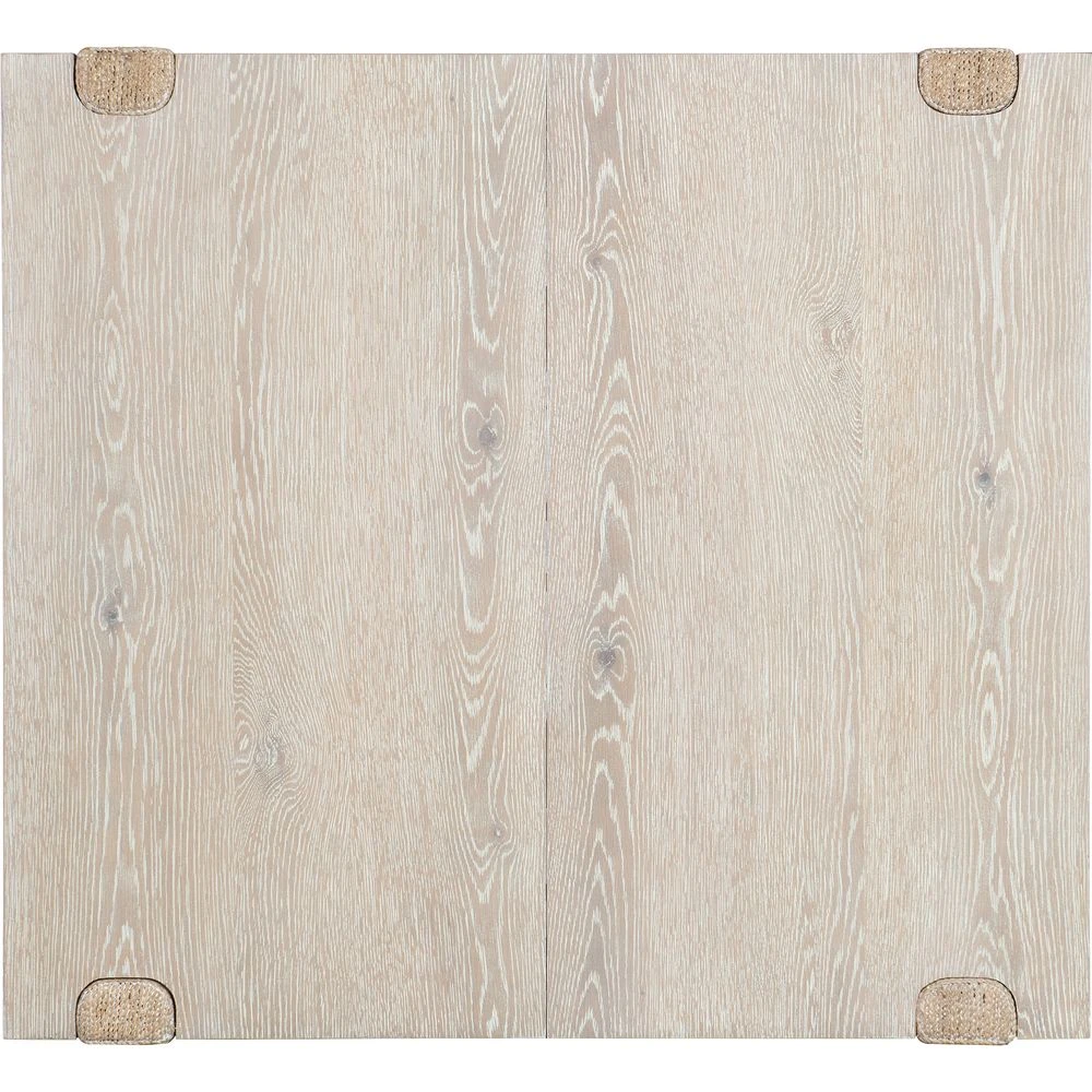 Description: Oak Veneers and Rope come together to create a tactile, organic and serene design in the Seaside Dining Table. Crafted of Oak Veneers, it has a natural light and transparent finish to reveal color and grain variances and is accented by distinct rope-wrapped legs. The 22-inch leaf extends the table to 77 inches long with the leaf in place.