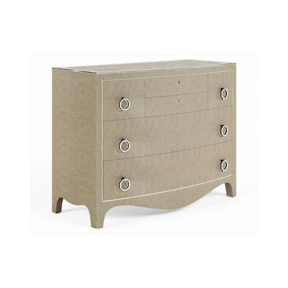 Equally suited as a nightstand or hall chest, the Cotidal accent chest imparts a classic form wrapped in Kravet performance linen with bone inlay framing the top and case front. Impeccable design standards include a decorative tassel on the top middle drawer, soft-close drawers and bone trimmed hardware. A polished glass top completes the classic vibe.