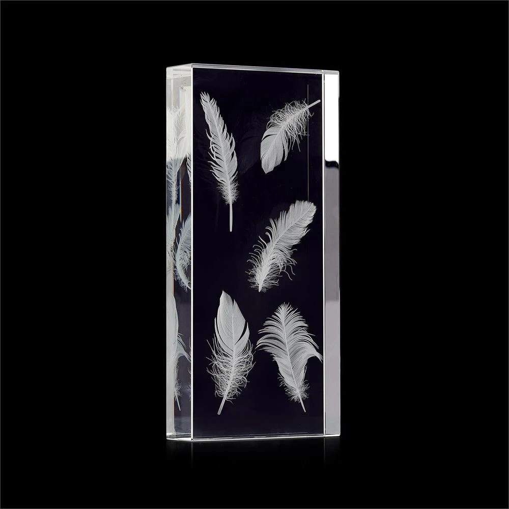 This stunning decorative accent displays five gorgeous white feathers suspended within a rectangular cut of clear crystal.