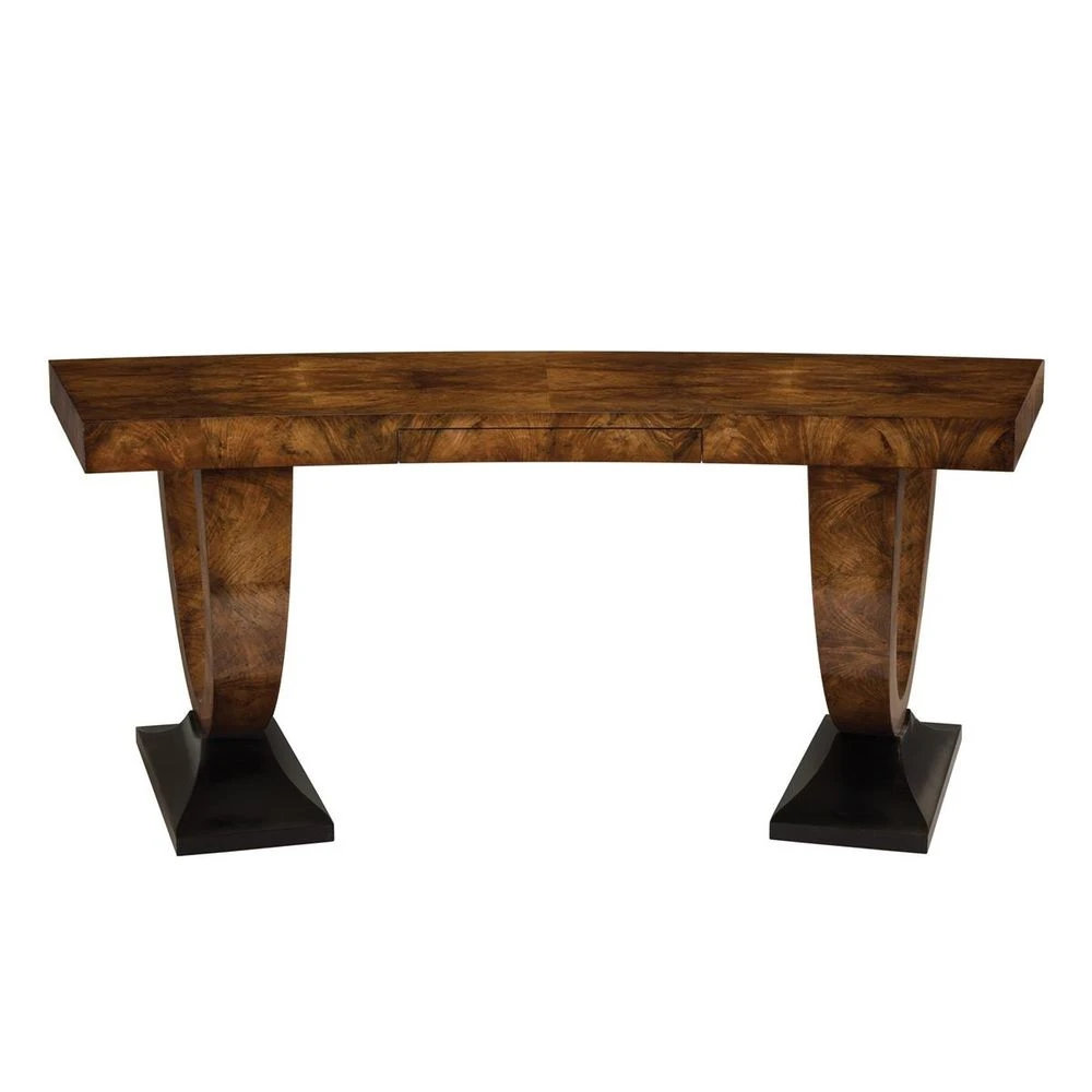 Exquisitely matched cerejeira veneer to the top and U-shaped supports are aged by a traditional French polish technique. The front rail conceals a pen drawer, while the supports have ebonized plinths.