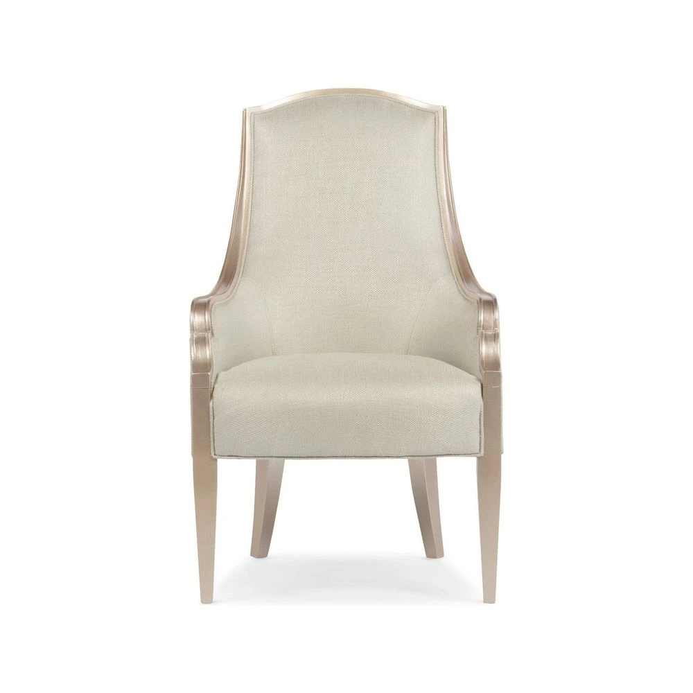 The Adela Arm Chair is a statement in refinement. Its clean lines feature a high back that reveals a gracefully carved frame in metallic Blush Taupe that sweeps around the back and down the arms of the chair to modern tapered legs. Dressed in cream tweed boucle fabric this chair has the elegance of an impeccably tailored Chanel suit.
