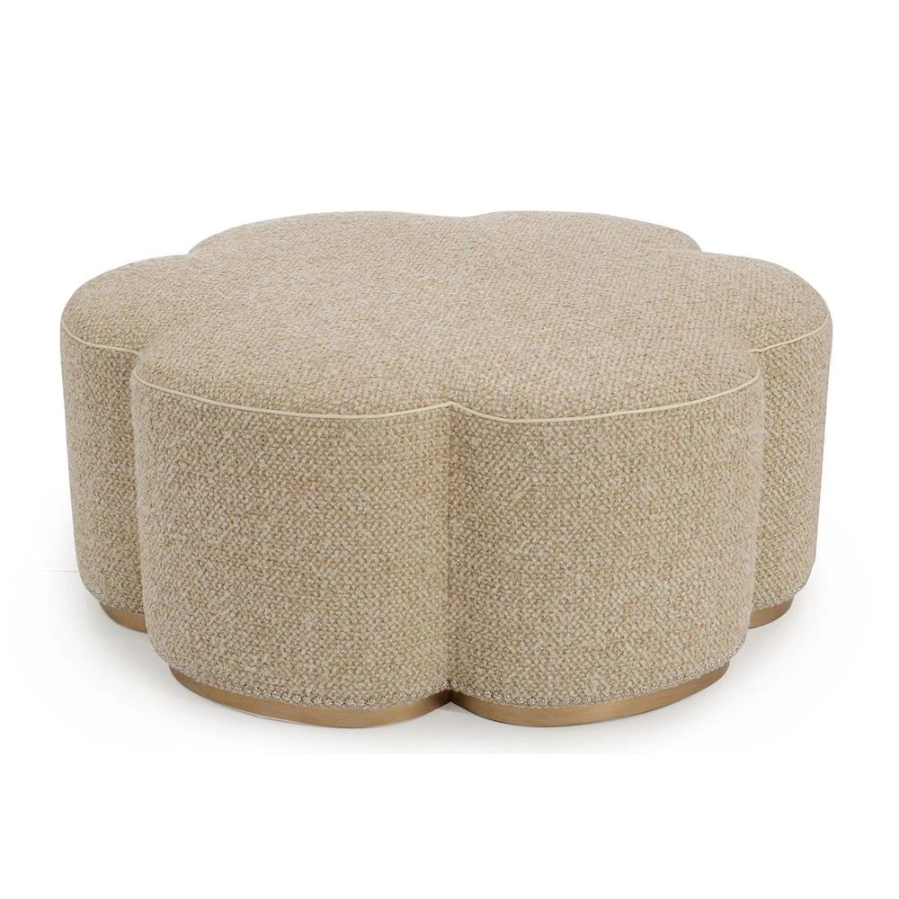 Description: This elegant cocktail ottoman features a round shape that is reminiscent of a modern dahlia. This design is upholstered in a light beige bouclé tweed that has a hint of metallic. It is enhanced with an ivory leather welt and a wood plinth base in Valyrian gold. The sophisticated shape is accentuated with a row of nickel starburst nailheads. This Rosalie Cocktail Ottoman is available as shown in Valyrian Gold (V229) finish and Poplin Oat (5020) fabric.