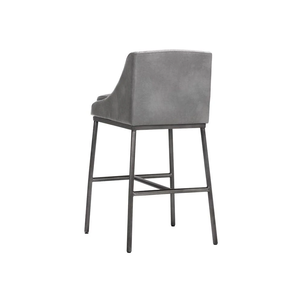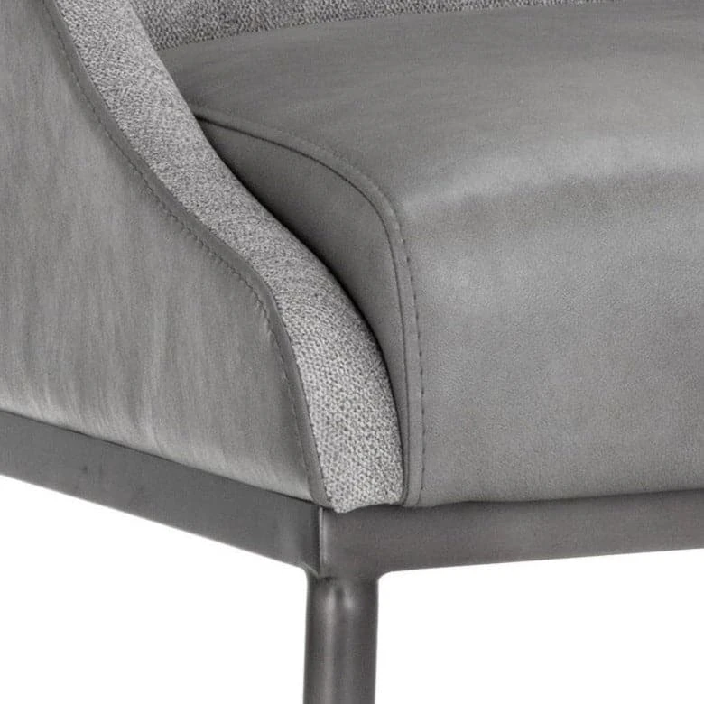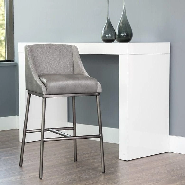 This barstool from our Ikon collection features a classic silhouette with contemporary flair. Features contrasting seat, seatback and exterior upholstery in bravo metal faux leather and polo club stone performance fabric. Brushed metal finish legs complete the look. Performance fabric is moisture repellent, stain resistant and easy to clean. Suitable for various dining, kitchen and bar spaces of all sizes. Handle With Care: This design has been crafted with faux leather. Faux leather is manufactured to reflect the natural characteristics of leather; as such, colour variations, markings, wrinkles, grooves, and light scratches are appreciated characteristics. No two pieces will be alike. Visit our Product Care page for more information on how to ensure the lasting beauty of this piece.