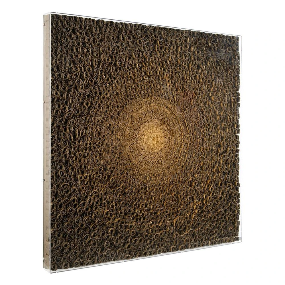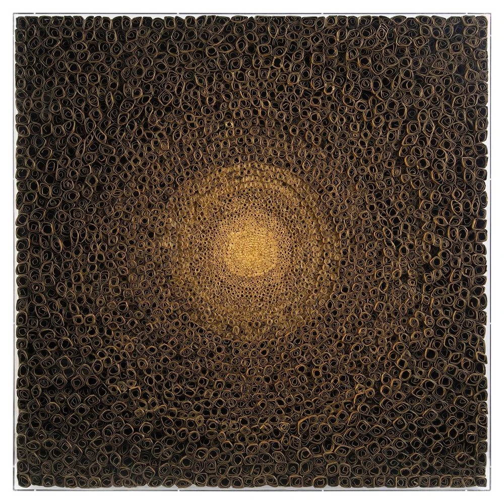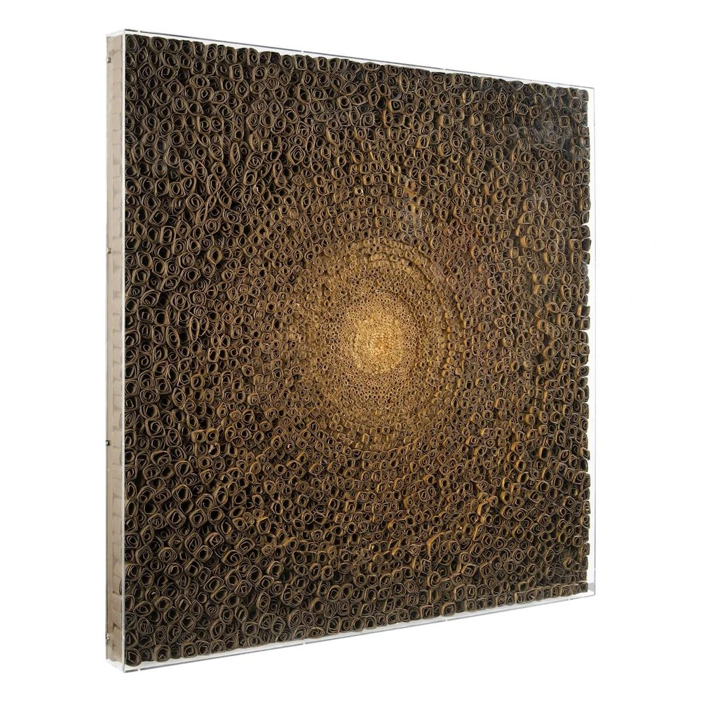 Cosmic Radiance by artist Daniel Fey is a mesmerizing piece of wall art that imbues an interior space with a stunning sense of depth and dimension. Hand-made from hundreds of individual rolls of paper atop canvas, the piece showcases intricate spirals that get smaller as the design reaches the center. The piece is displayed within a clear acrylic box and affixed with keyhole hangers.