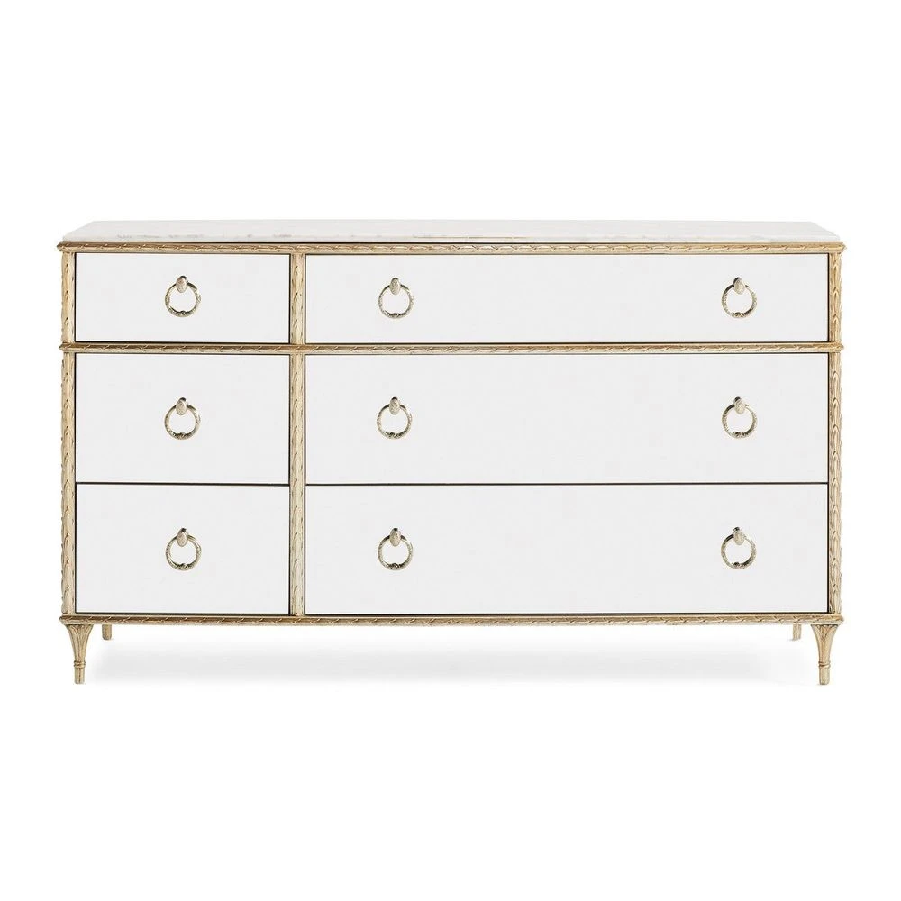 Exuding one-of-a-kind style, this elegant double dresser draws inspiration from the timeless beauty of antique Baroque picture frames. Richly carved laurel leaf motifs are brought to life in an Aglow finish surrounding this nightstand’s exquisite mirrored exterior. Six spacious drawers offer generous storage for your wardrobe and are fully finished in a soft Creme De La Creme. As functional as it is fashionable, this distinctive dresser also features a √Çæ-inch Carrara white marble top that adds durable functionality while reflecting its classic design roots. As you appreciate the offset placement of its mirrored drawers, you’ll notice custom-designed ring pulls with vintage cameo summarys reflected in splendor.