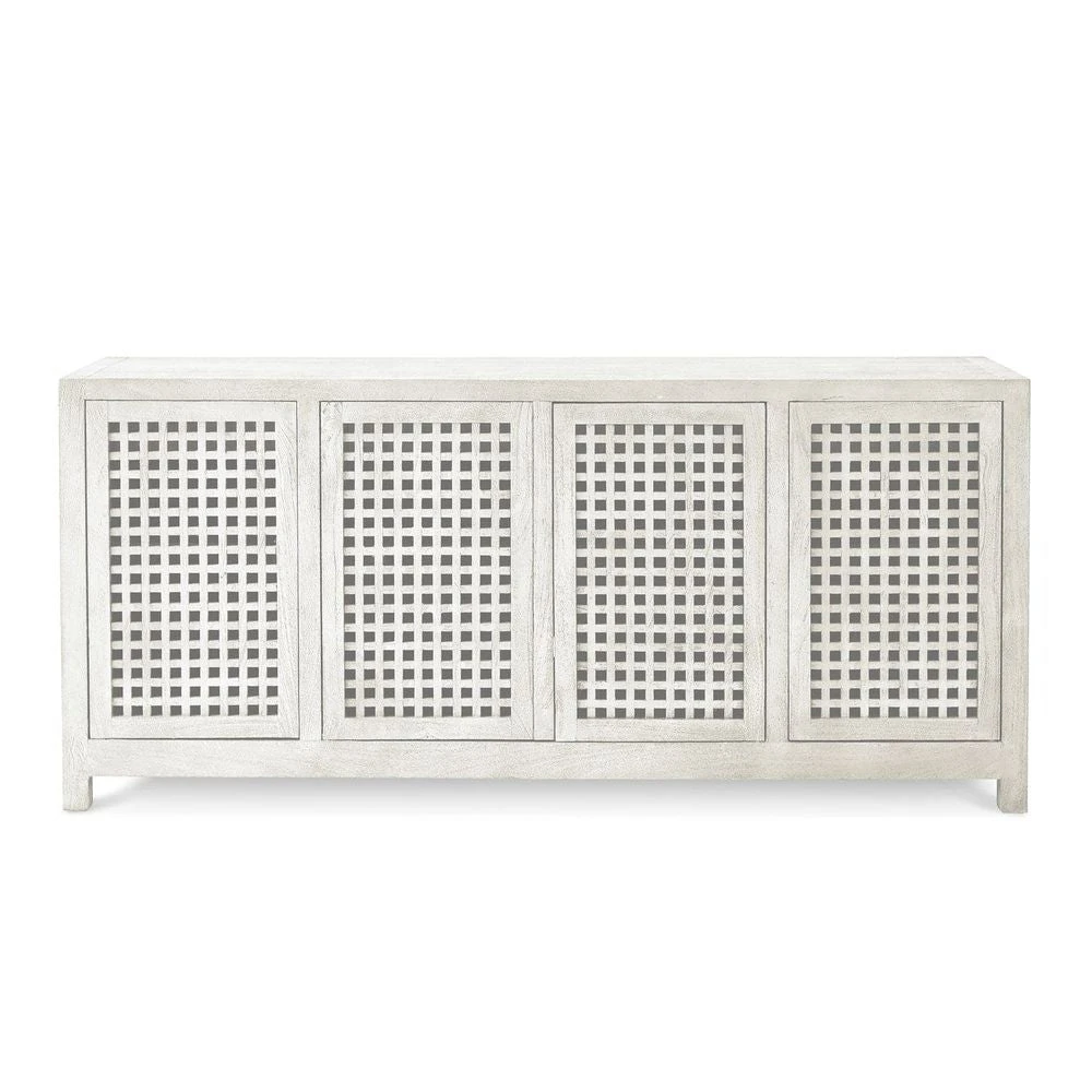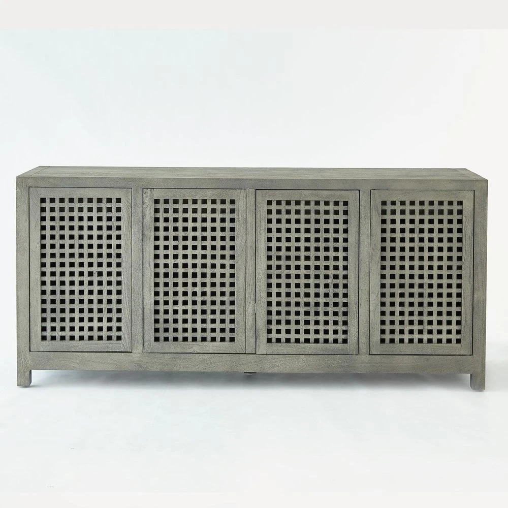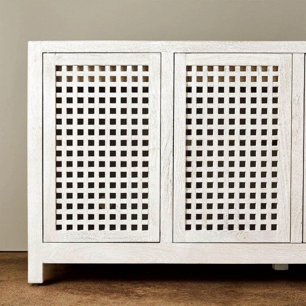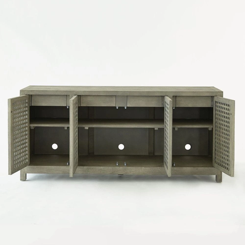 Inspired by the soft, sandy hues of the seaside, the distinctive, sun-bleached look of the Driftwood Collection is achieved by first lightening the mango wood, then applying a subtle, creamy wash. Handcrafted lattice doors, adjustable shelves and four interior drawers. Media cut-outs in the back.
