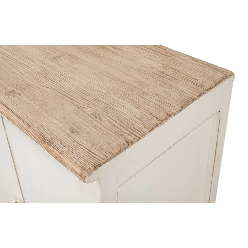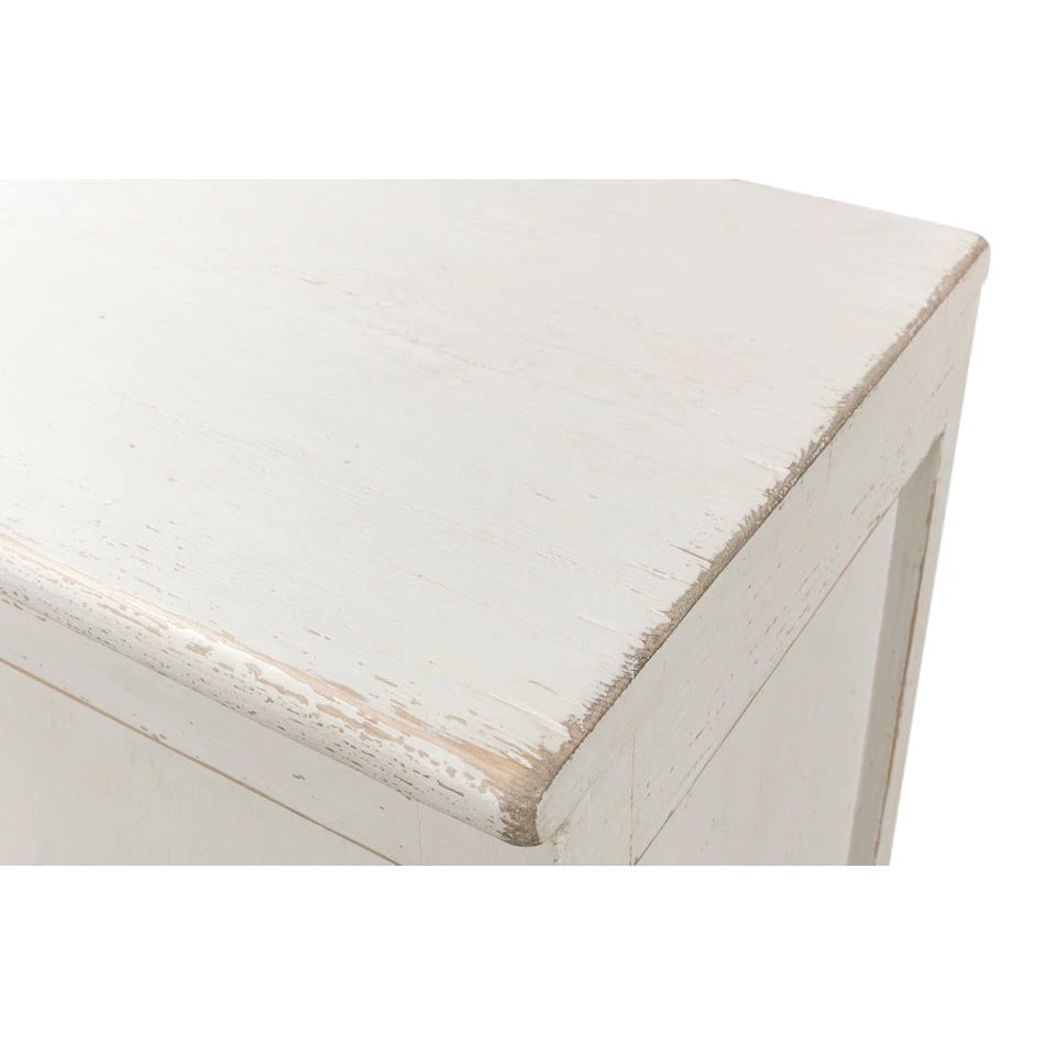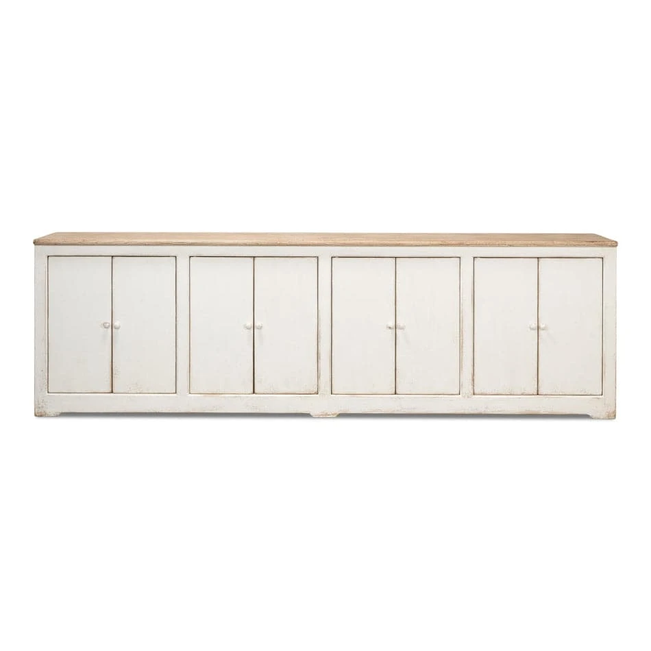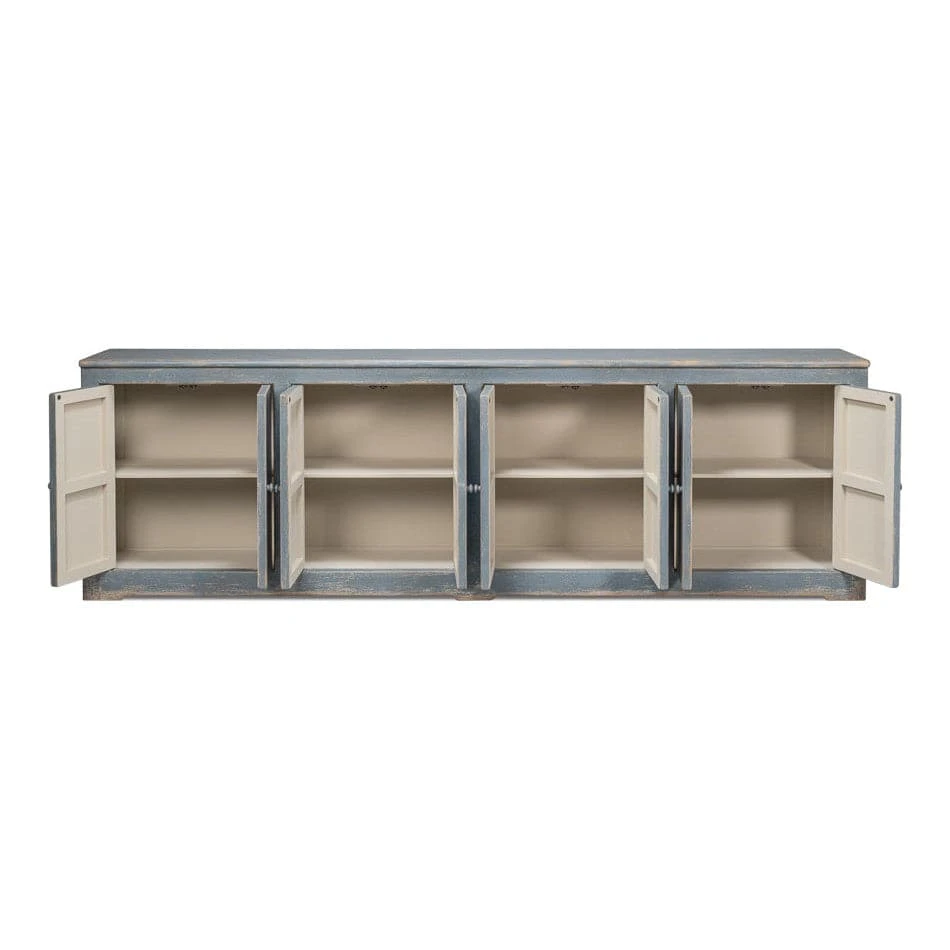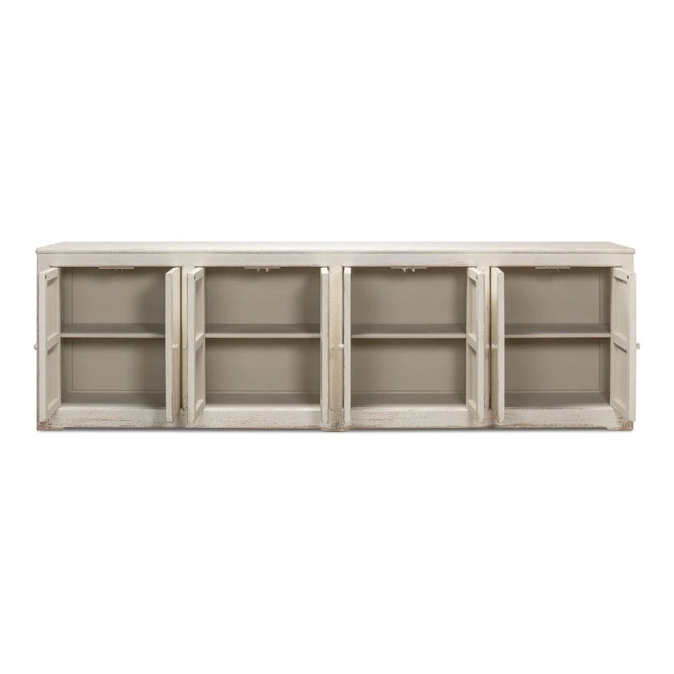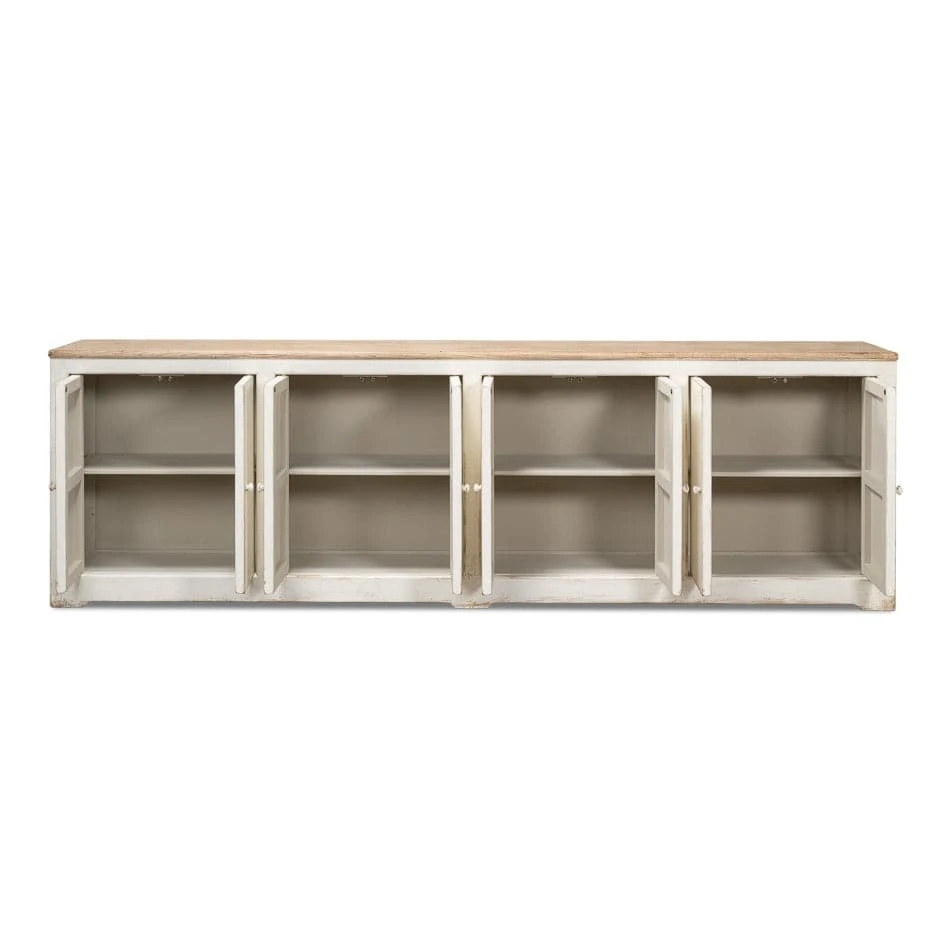 A soft painted rub through finish presents this cabinet that is formidable in length, practical in height, and just plain irresistible in looks. If you decide to remove the four shelves from the interior, don”t be surprised if the kids play hide and seek in it.