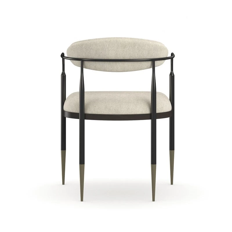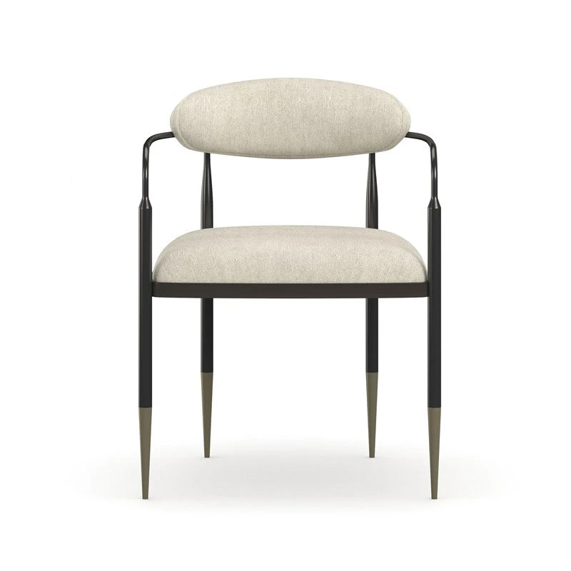 This armchair lives up to its memorable name. Epoch is a study in contrasts. The oval, curved back and tight seat feature Ivory woven performance fabric. The back and seat float in an open, dark frame in Deep Bronze metal enhanced with Champagne Gold metal ferrules. This is a piece that compliments classic or contemporary décor.