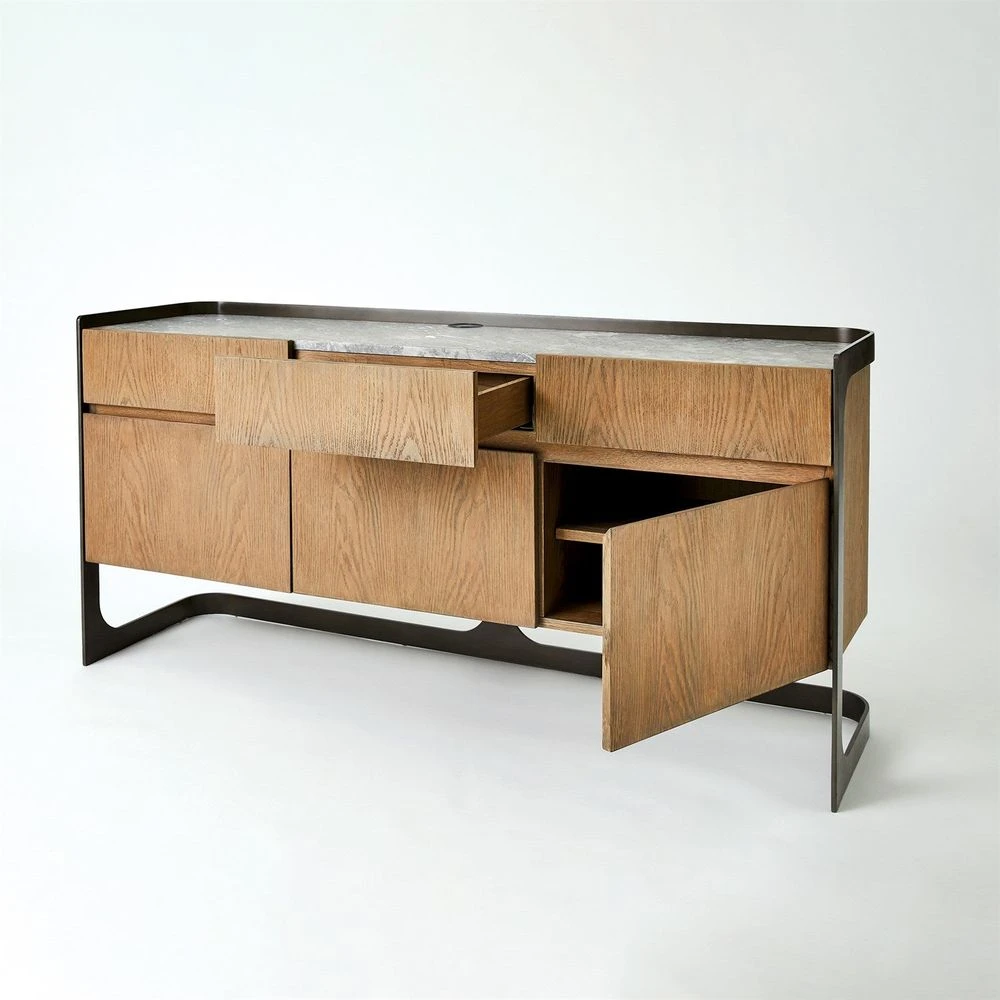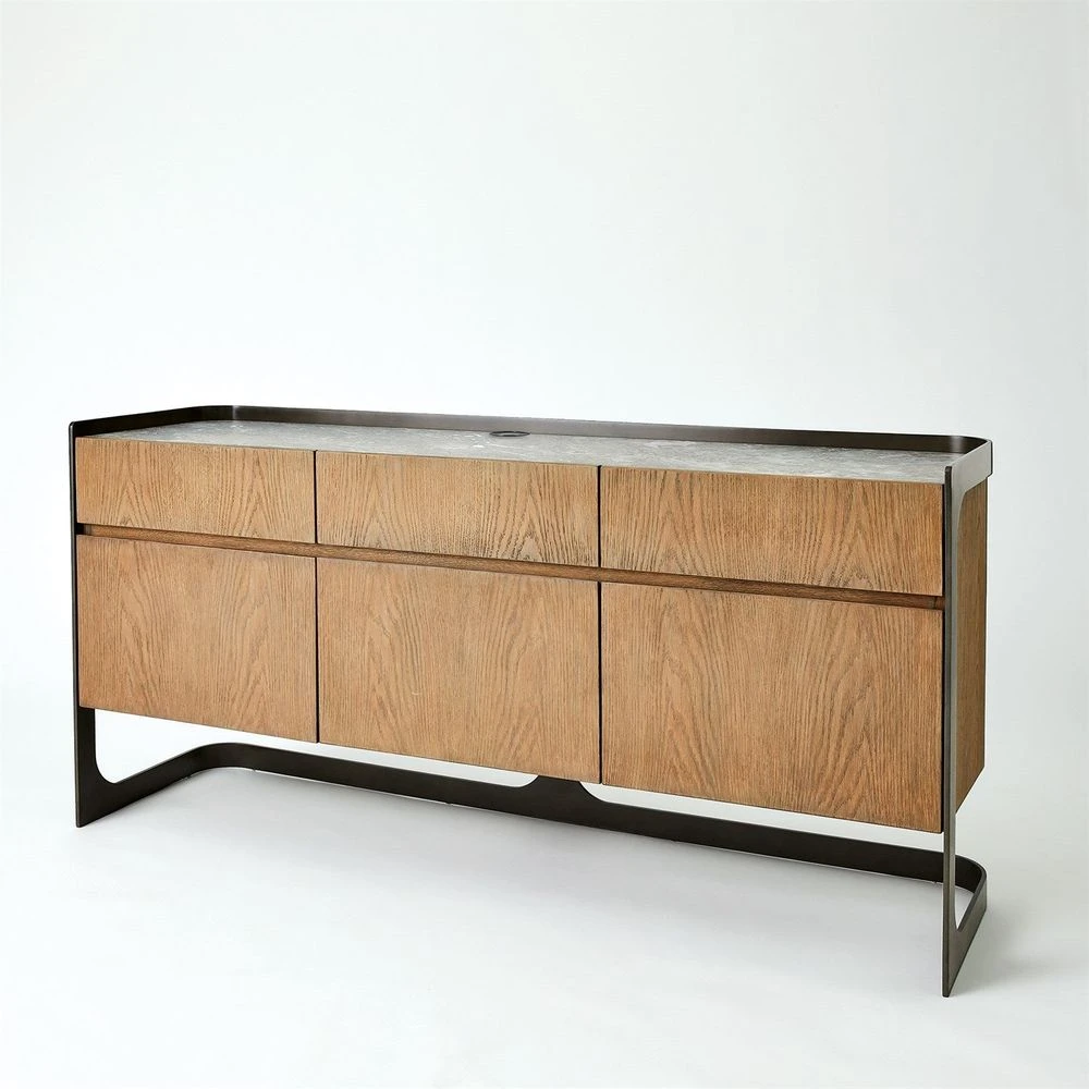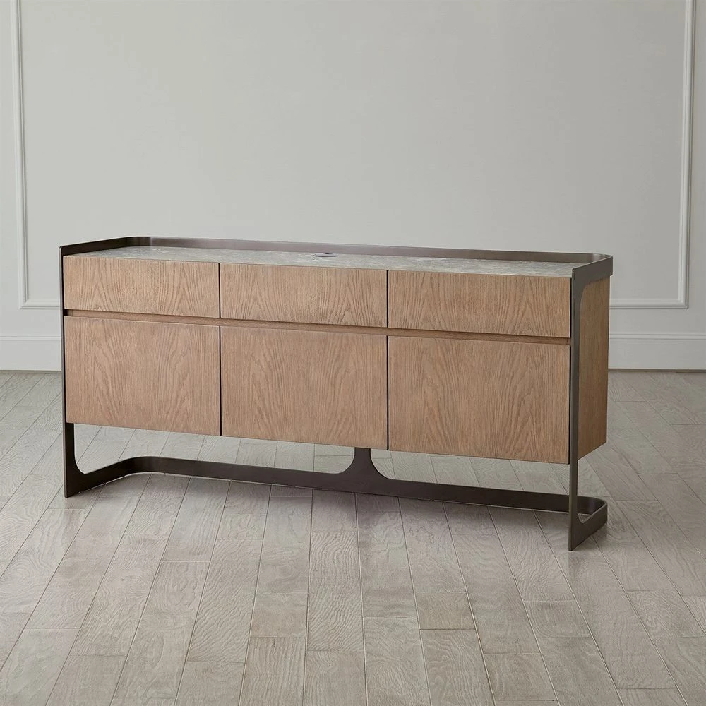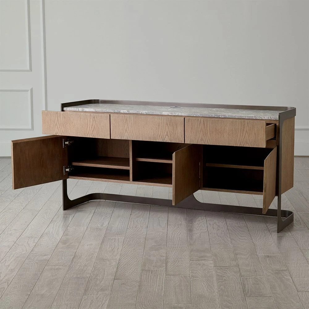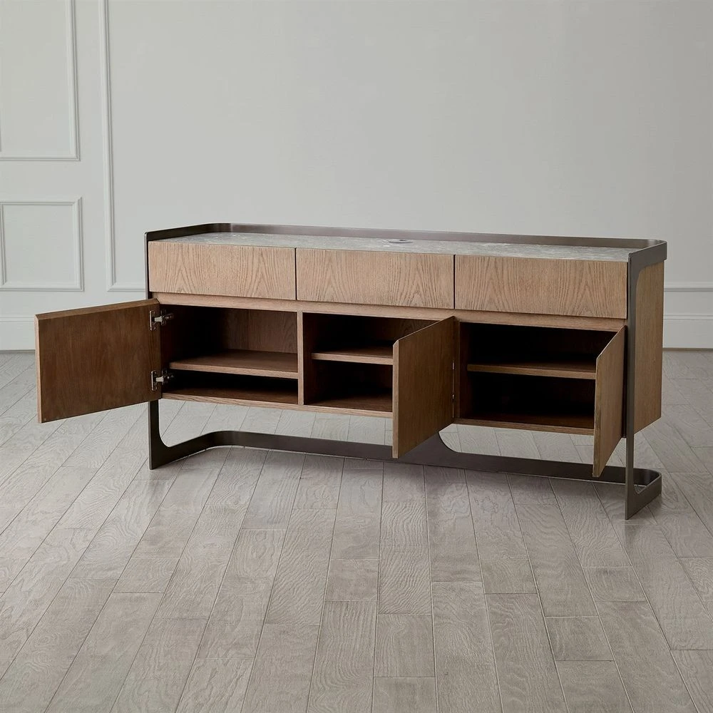 Description: The Element Media Cabinet is constructed of American Oak veneer with a warm Aspen grey finish and a grey Spanish marble top surface. The cabinet features three storage drawers and three cabinet doors with adjustable shelving. Includes soft-close drawers and doors.