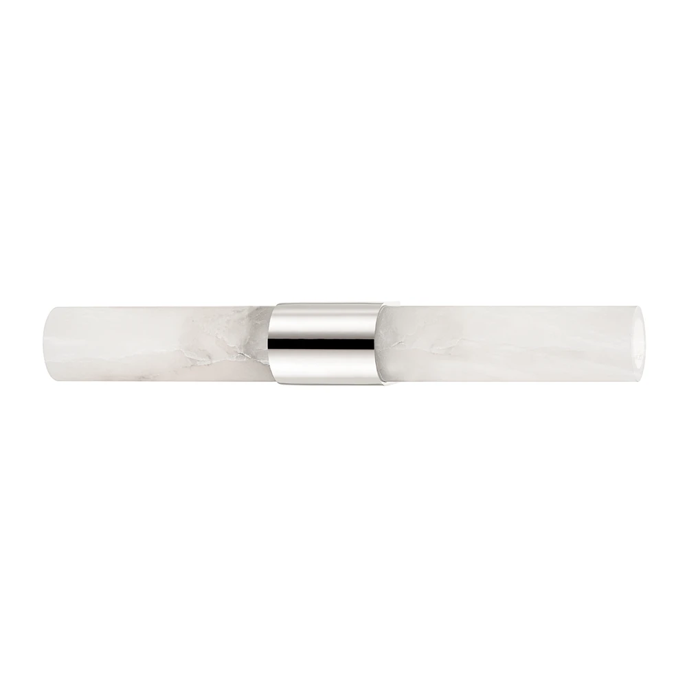 The very definition of minimalism, less is truly more with Ellington. The sculpted metal collar doubles as a backplate, attaching the sconce directly to the wall without the need for any additional adornment. The real focus of this fixture is the alabaster tube shade. Equally as beautiful unlit, the alabaster gives off a gorgeous, soft glow when filled with light. This smooth and stylish sconce comes in aged brass or polished nickel finishes.