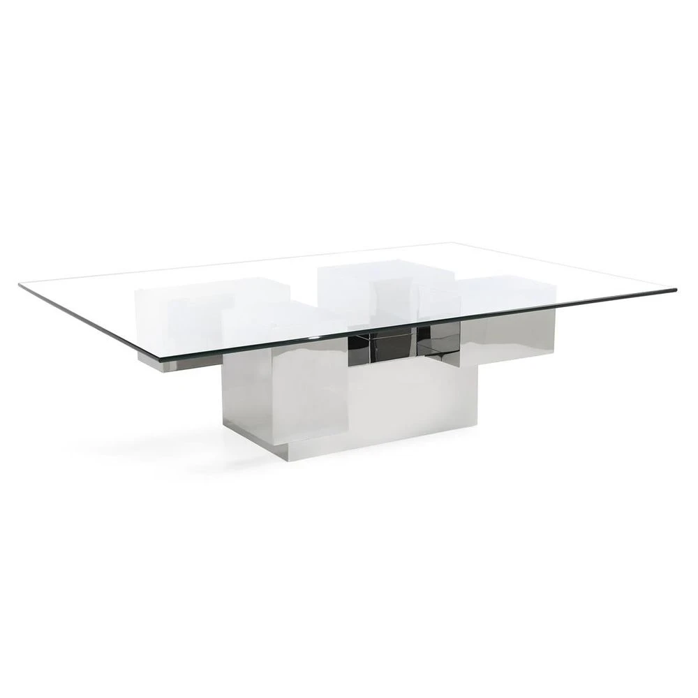 The Exquisite Cocktail Table is a stunning, geometric piece that exudes contemporary charm. Crafted from polished stainless steel, the base consists of five polygons of varying sizes arranged in a creative display. A tabletop of rectangular tempered glass pairs beautifully with the metallic tones of the base.