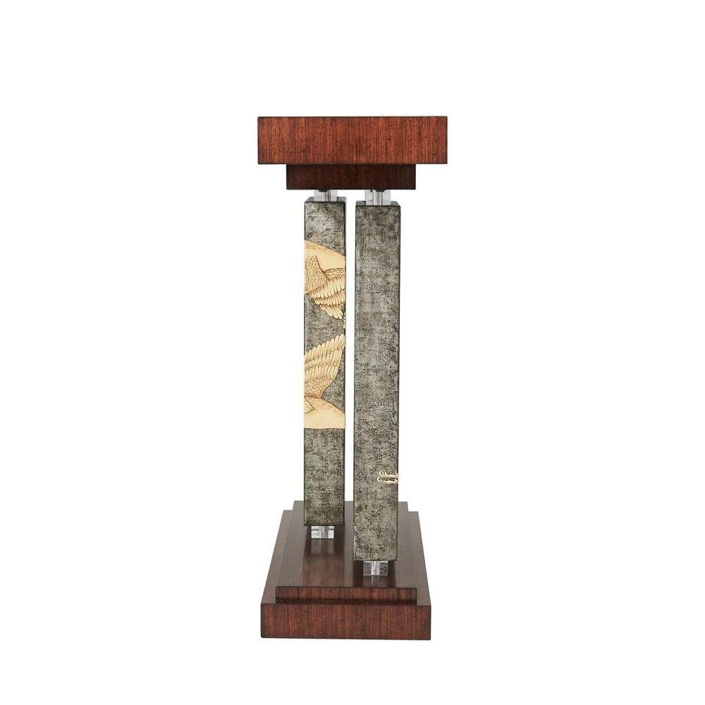 A Hyedua veneered console table, the rectangular top supported by two offset pewter Argento panels painted with flying cranes and with acrylic bases and capitals, on a stepped plinth base.