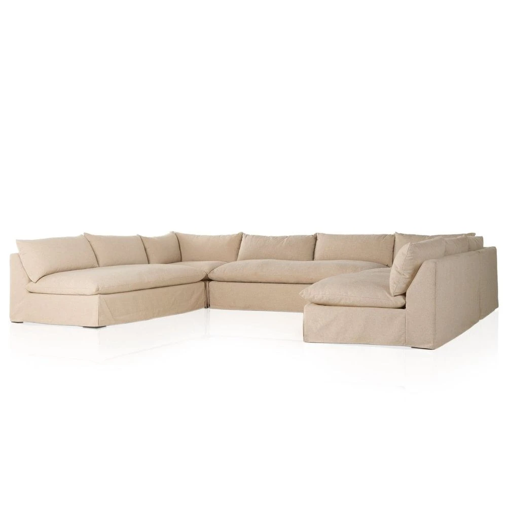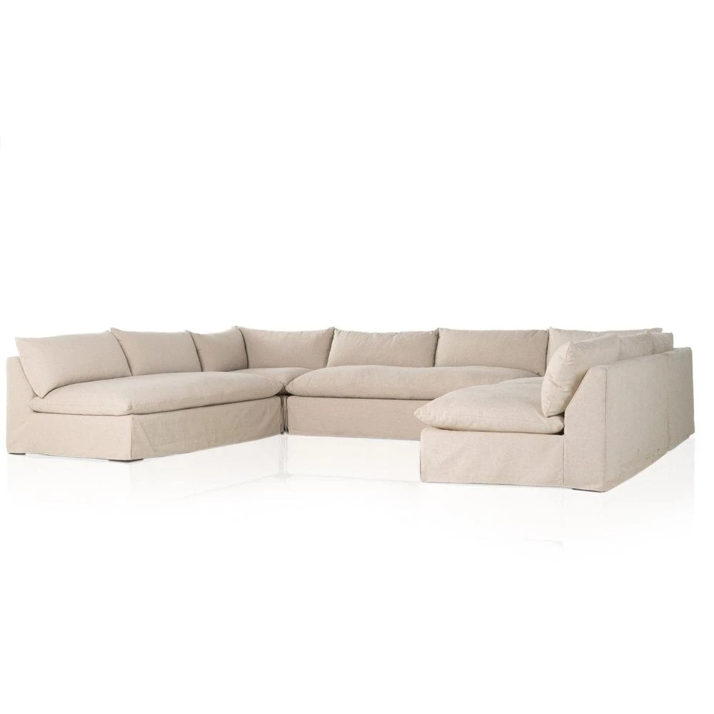 A new slipcovered version to a classic silhouette. A streamlined sectional is topped in a fully removable slipcover crafted from a soft linen/cotton/poly blend. Subtle texture throughout brings a casual coastal look and movement to the entire piece. Performance fabrics are specially created to withstand spills, stains, high traffic and wear, ensuring long-term comfort and unmatched durability. Slipcover can be removed for machine washing; steaming recommended.