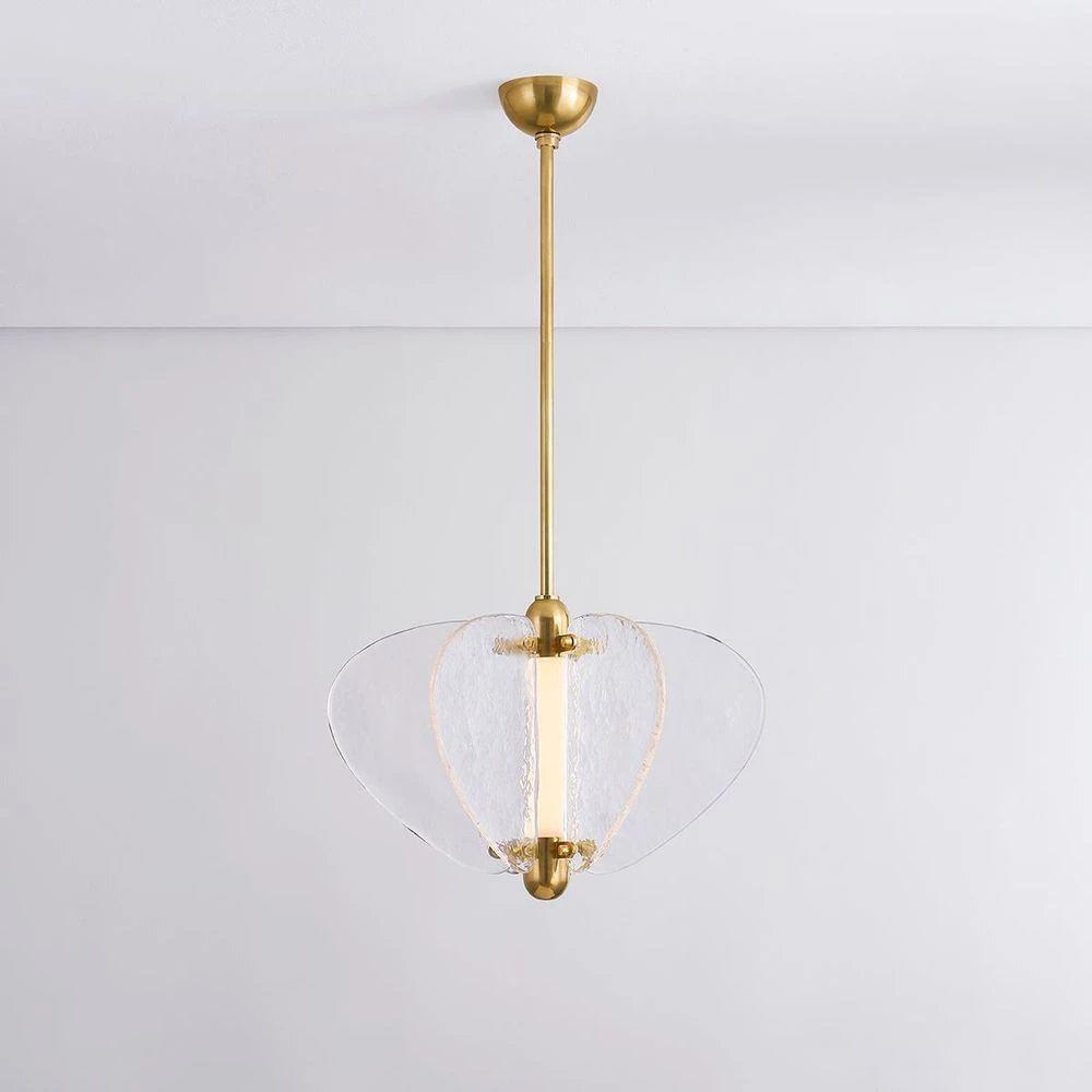 A frosty chill meets the warmth of LED in this sculptural pendant light. Resembling sheets of ice, four thin Piastra glass blades with chill marks extend from a central opal glossy glass core. A Vintage Brass framework provides a golden glow that enhances this pendant�s sparkle when lit.