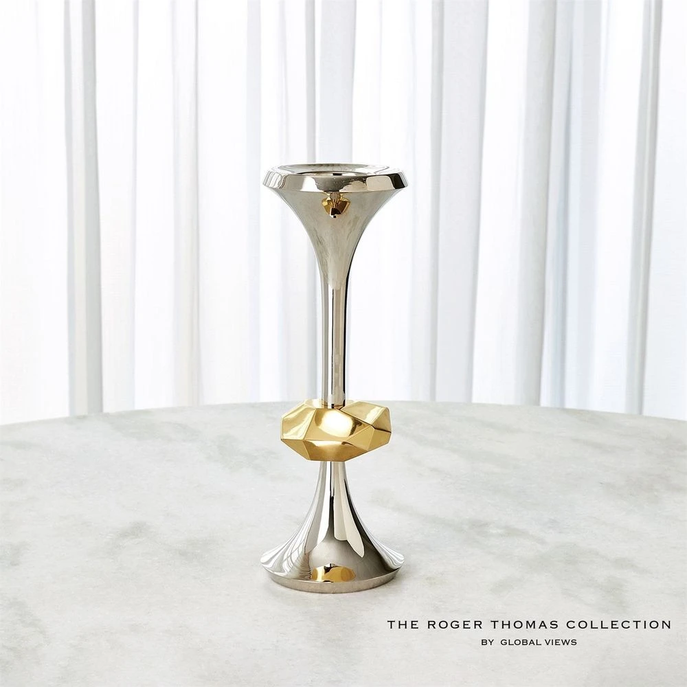 The Gabriel Nickel Candle Holder is made of nickel-plated brass and shiny brass and shiny brass and nickel-plated brass. Holds 3 inch pillar candle.