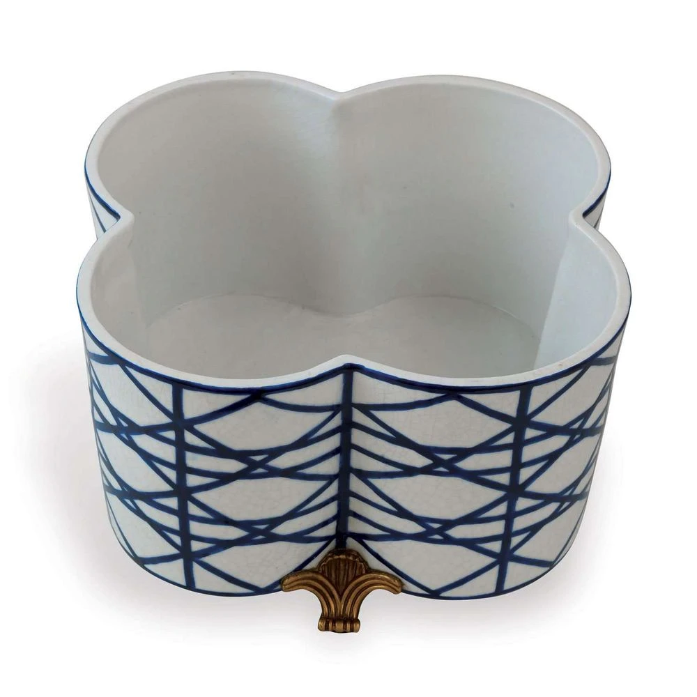 - Classic shaped quatrefoil planter. Featuring our blue “Gazebo” pattern, the antiqued crackled white porcelain centerpiece planter is shaped to hold four-6″ diameter plants. Perfect for a spray of white orchids. Accented with solid brass feet.