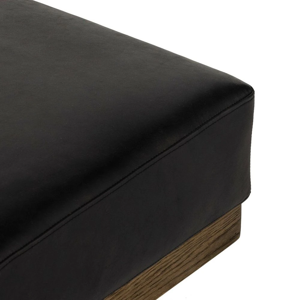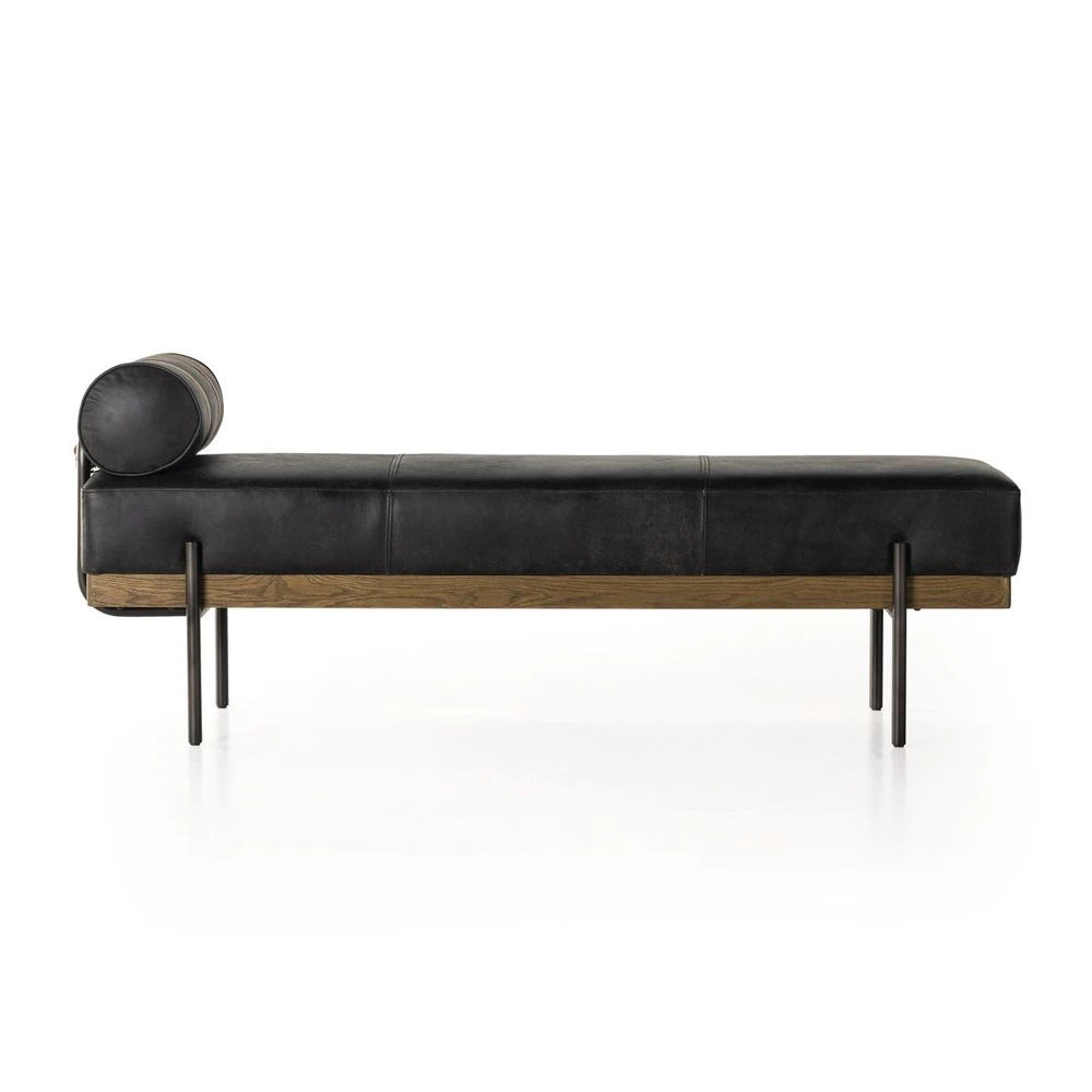 Ebony leather lends a high-end look to bench-style seating ideal in the entryway, living space or foot of the bed. Secured by top-grain leather buckle straps, a removable bolster can be positioned on either end of the bench with ease. A grey oak base and black iron framing finish things off for a sleek material mix.