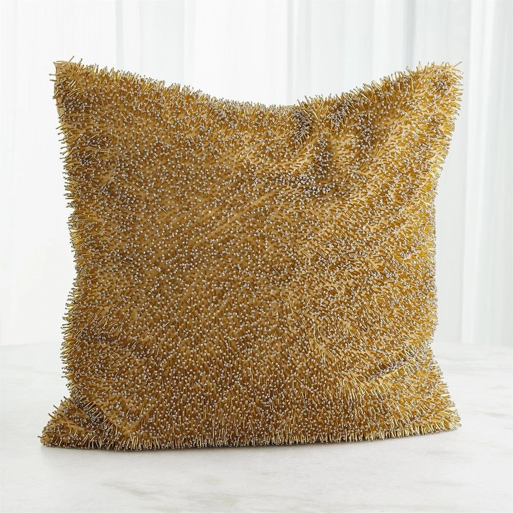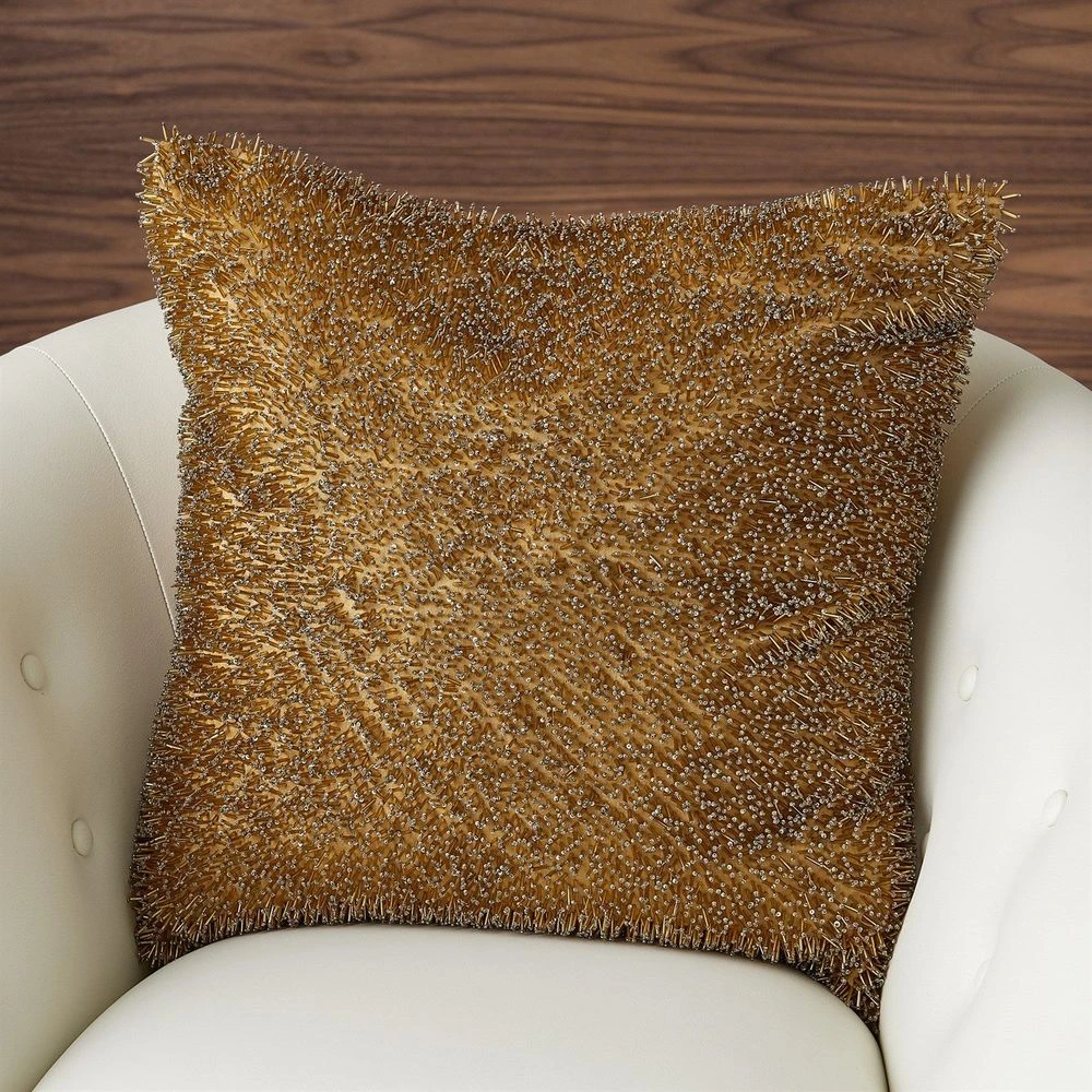 Description: The Golden Beaded Shag Pillow stands out as a masterpiece crafted with hand-beaded glass beads and features a luxurious down-fill insert.