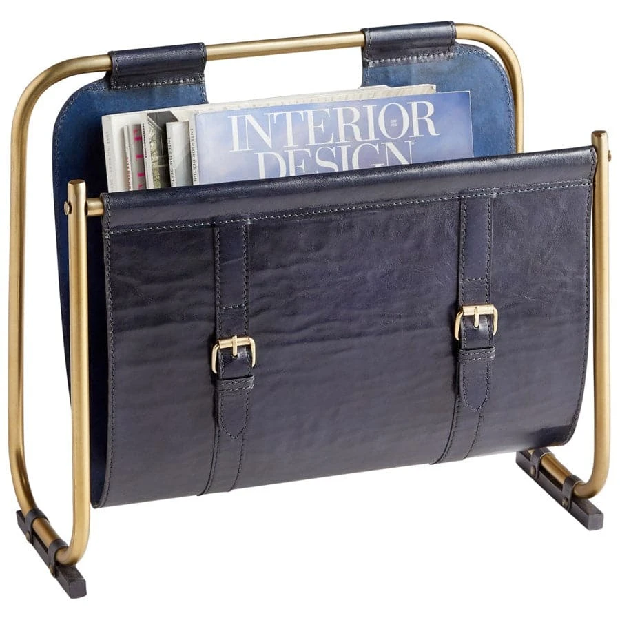 A beautiful way to add elegance to a living room or lobby, the Granville magazine rack is an artful addition to any ensemble. Crafted of iron, wood, and leather, this storage container features exceptional attention to detail, creating a sense of masculine luxury in its combination of dark tones and warm metals. The mix of midnight blue and antique brass elements are key to creating a stunning transitional or contemporary home accent.