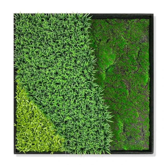 Satin black painted hardwood frame with wood grain texture, an open front and no glass. Made to order, use alone as a textural focal accent wall design or place side-by-side to create a Green Wall that will cover a large area. This design uses our permanent moss. Compared to preserved mosses, our permanent moss has a strong tolerance to discoloration and will slightly shed during installation. Even though our moss is strong, it is manufactured for indoor use only and is not intended for high light areas or direct sun. As with anything, discoloration could happen over time. Contact us to manufacture your site-specific design. We are sorry if some components are out of stock at time of purchase. To meet your delivery, we can easily substitute similar botanicals. Security hardware included. Indoor only.