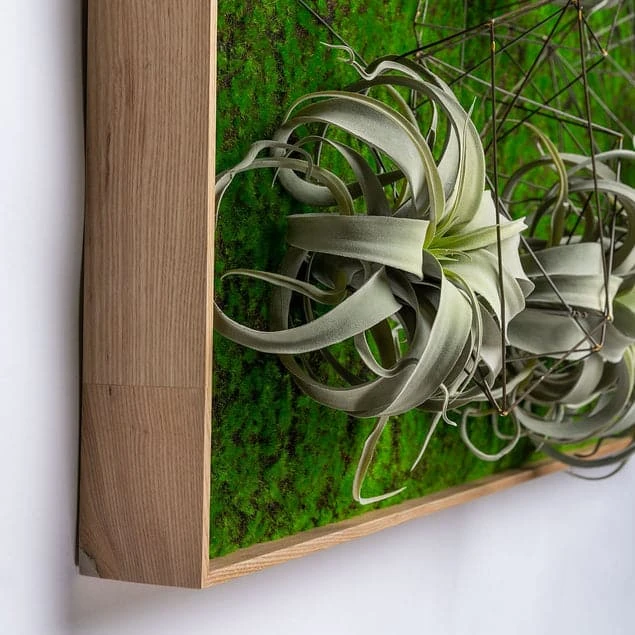 Simple beauty is framed using our natural hardwood shadow box with wood grain texture, open front, and no glass. Our dimensional Wire Crystals are hand-crafted of hefty raw natural iron wire with natural brass welds and a tough clear powder coated finish. We love mixing sculptural elements with our many types of air plants. Hang horizontal or vertical. This design uses our permanent moss. Compared to preserved mosses, our permanent moss has a strong tolerance to discoloration and will slightly shed during installation. Even though our moss is strong, it is manufactured for indoor use only and is not intended for high light areas or direct sun. As with anything, discoloration could happen over time. Contact us to manufacture your custom design in almost any size and color. Hanging hardware included. Indoor only.