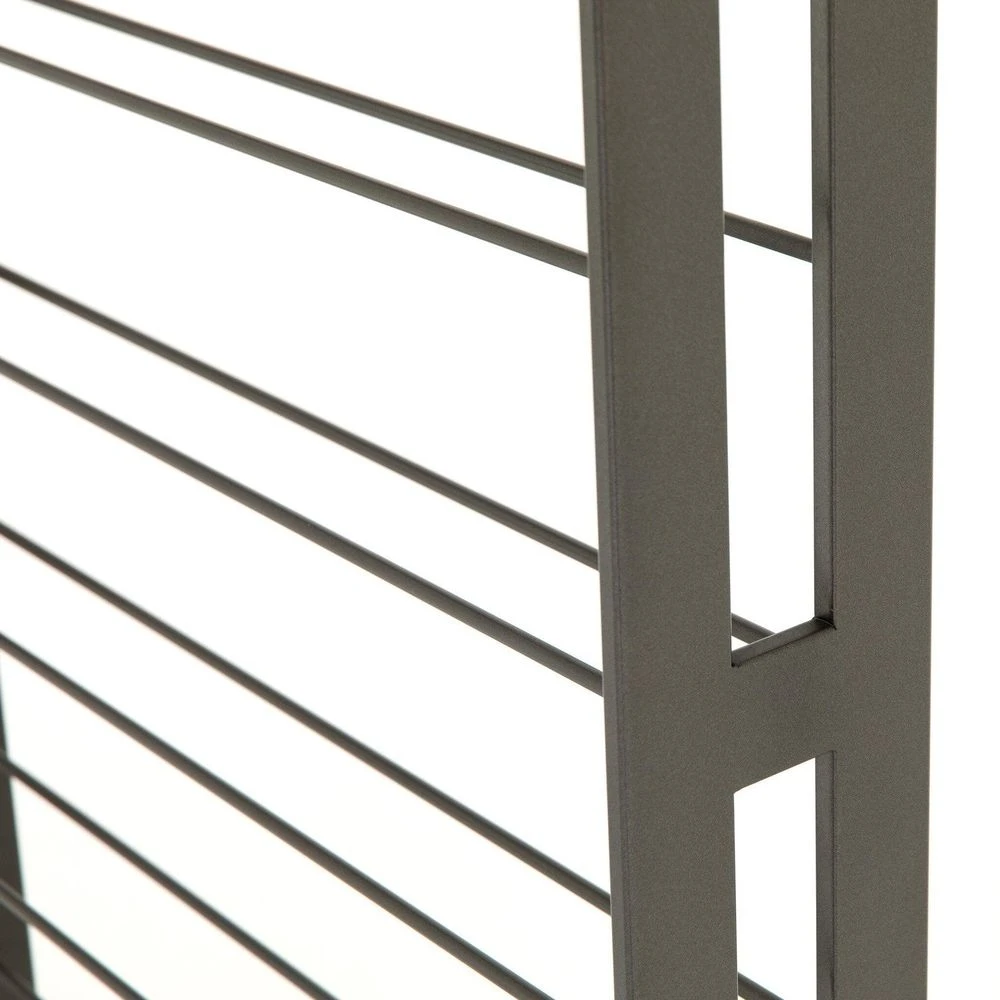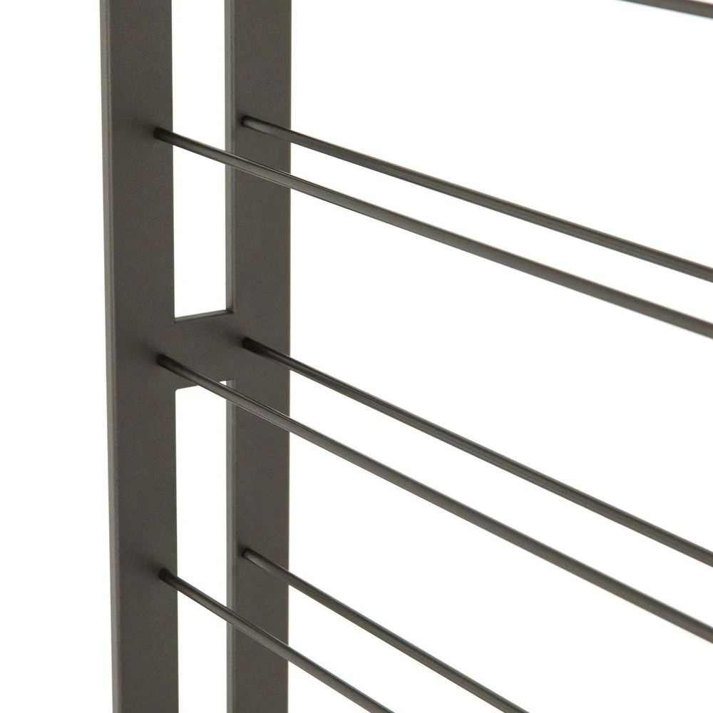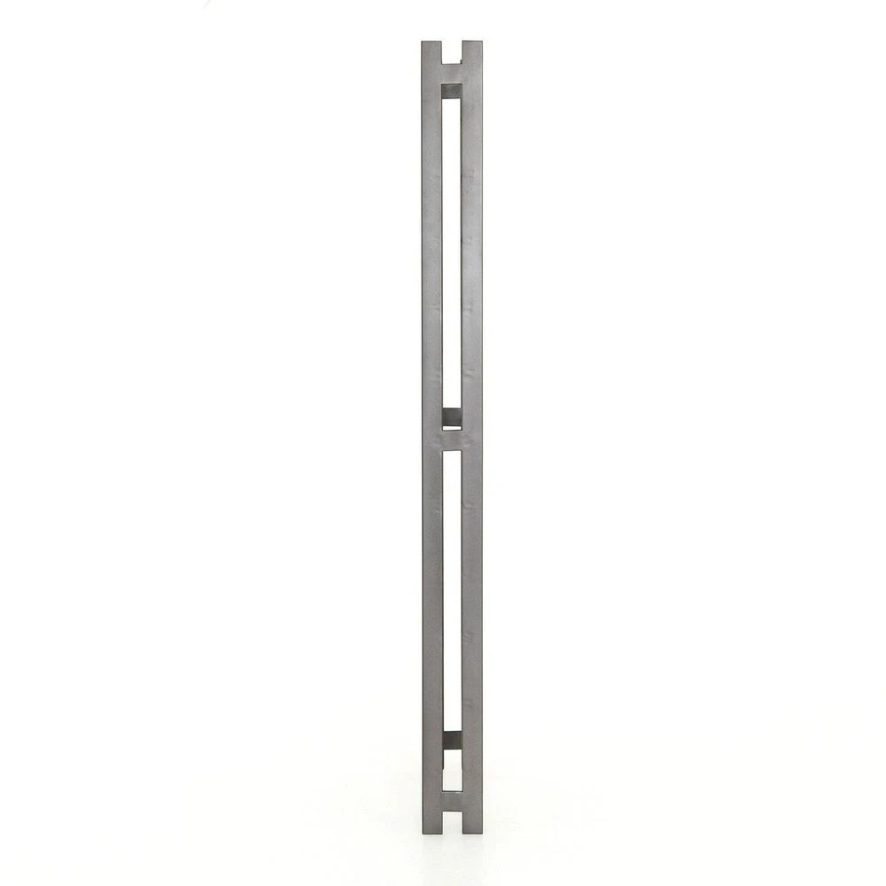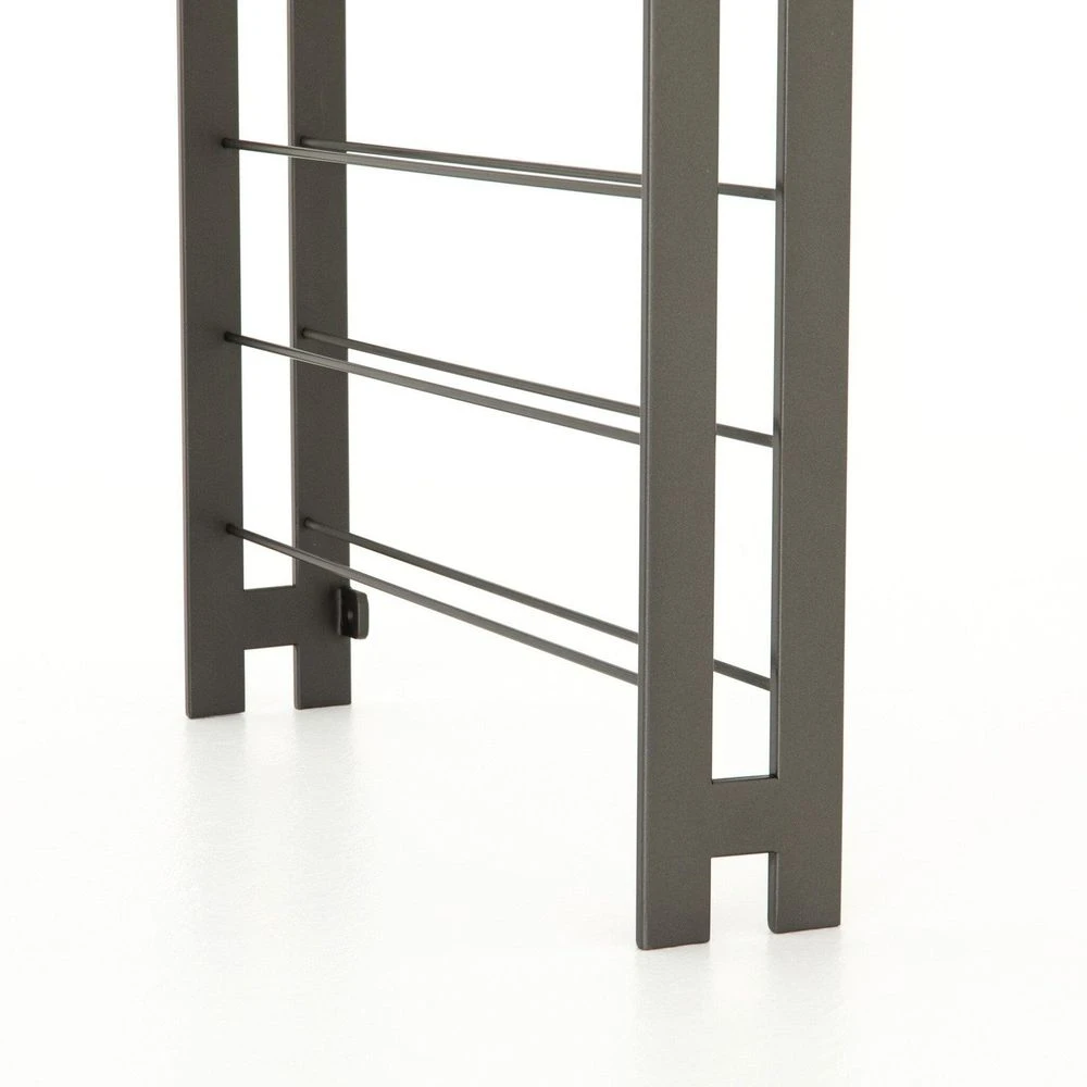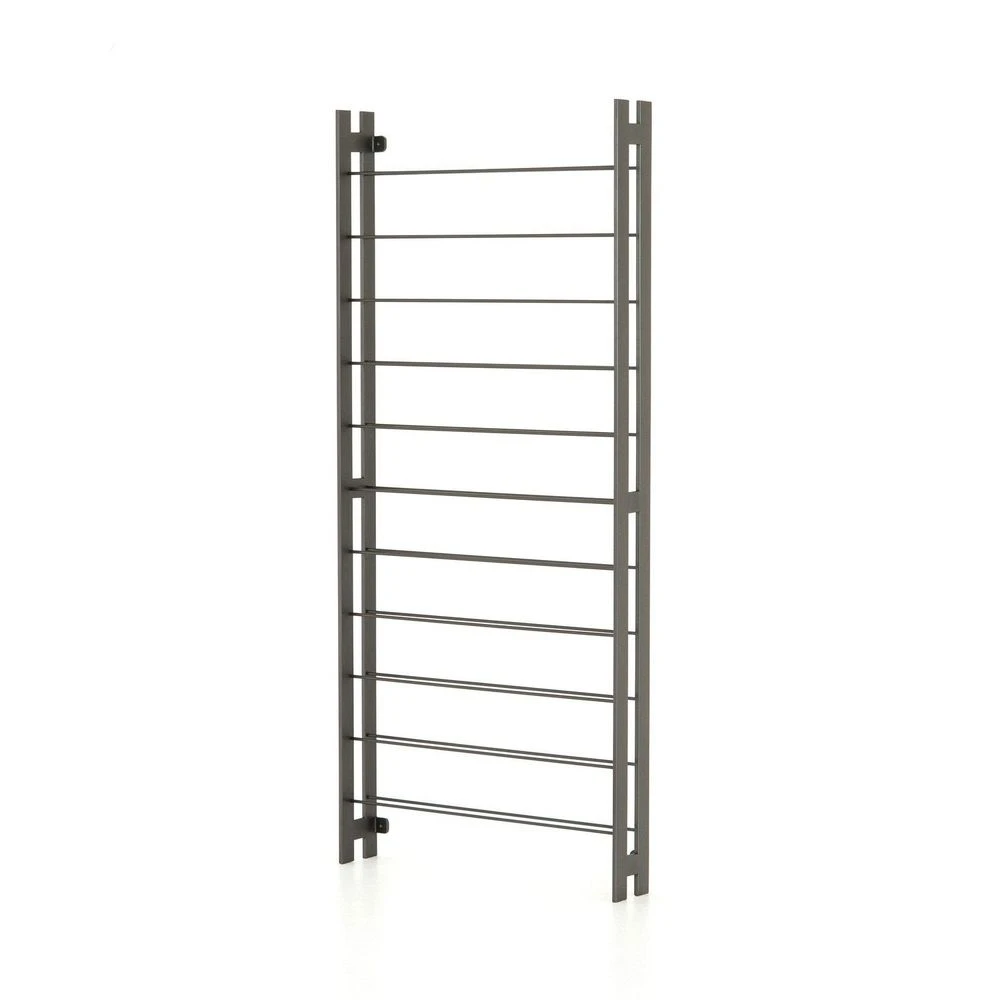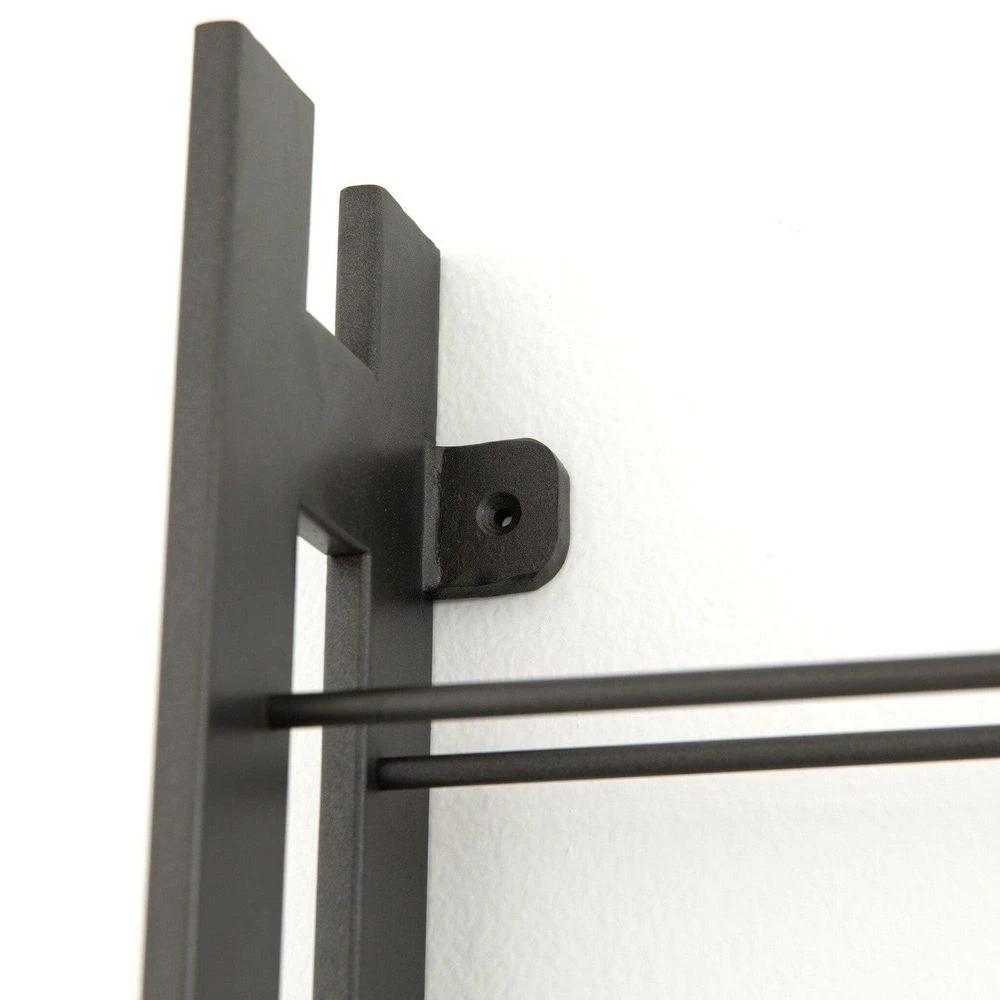 - Description: Store – and sip – in style. Tall, wall-mountable iron wine rack is finished in gunmetal, with open shelving for proper storage and stylish display of favorite wines. Anchors included.