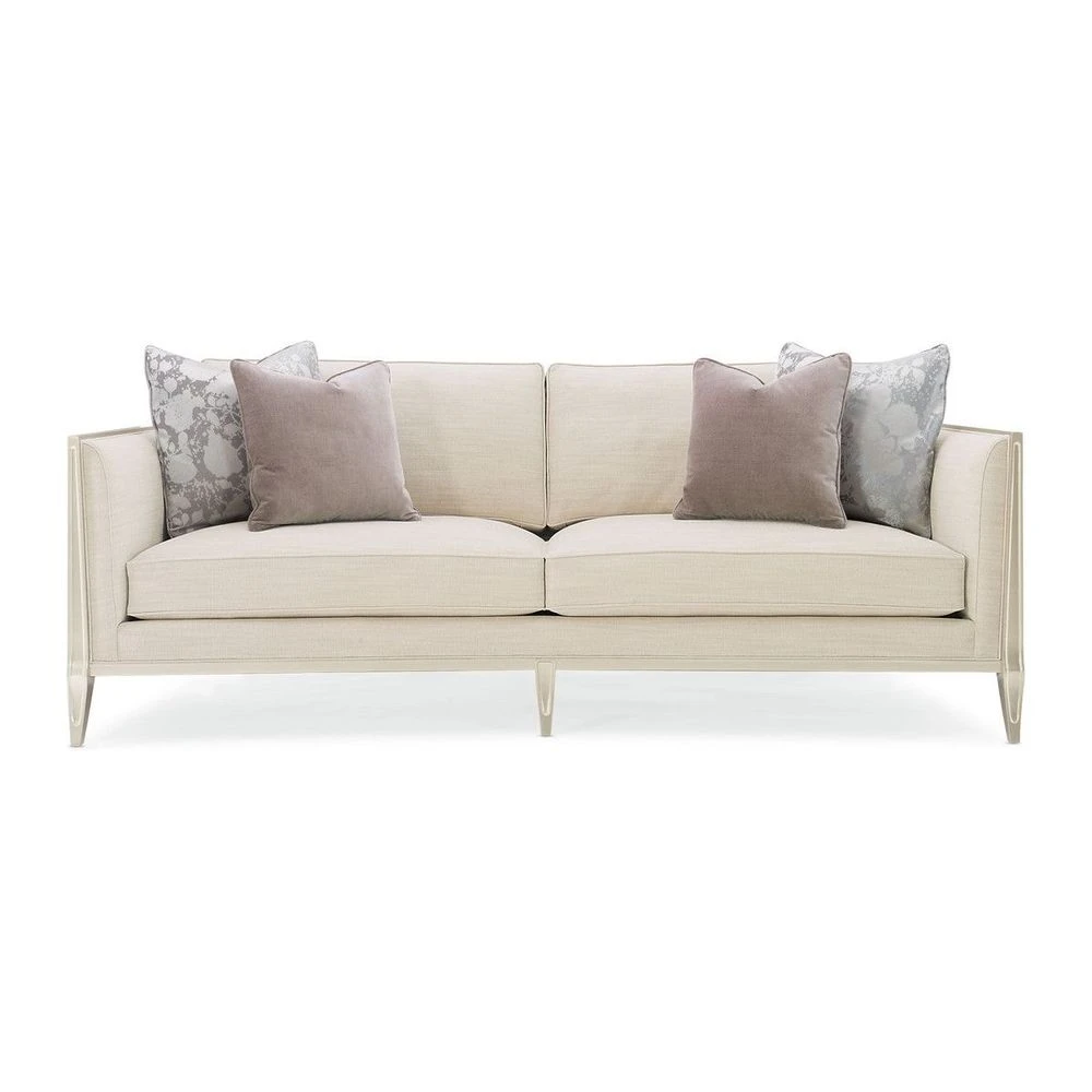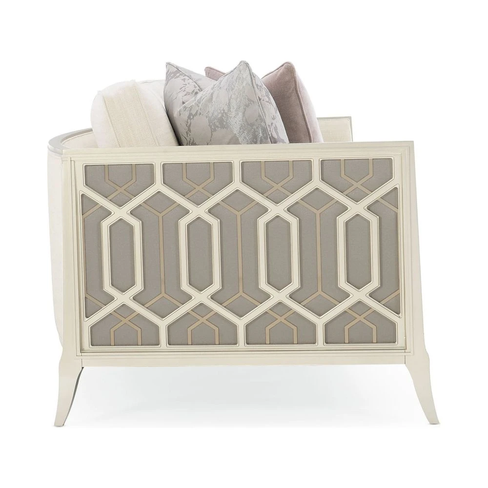 Every time you see the Just Duet sofa, you’ll remember the remarkable story behind its design inspiration. Its sumptuous seating area is bordered by a one-of-a-kind wood frame featuring carvings inspired by the patterns of a palace balcony railing in India. The layering of metal fretwork behind the wood was inspired by the dual shadow cast on the balcony by the setting sun as seen through the railing’s design. Creating a high fashion look unique to itself, these elements are highlighted with illuminating shades of Soft Silver Paint and Champagne Gold. Exquisite fabrics and touchably luxe accent pillows complete its appeal.