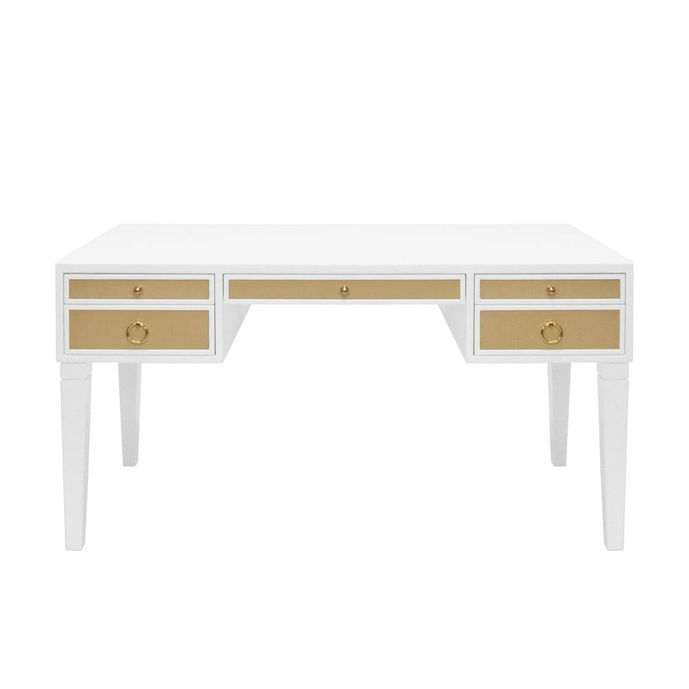 Description: Some may say the Heidi desk was designed solely to revive the lost art of penmanship – but whether you use it for writing letters or emailing them, you’ll love the exquisite luxe tailoring in any contemporary home office. Contrasting natural grasscloth drawers add an organic feel to this timeless, matte white lacquer frame. Brass hardware completes the look.