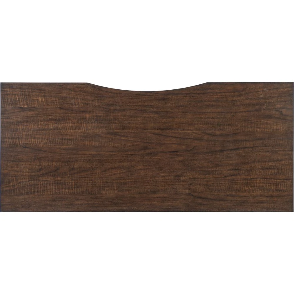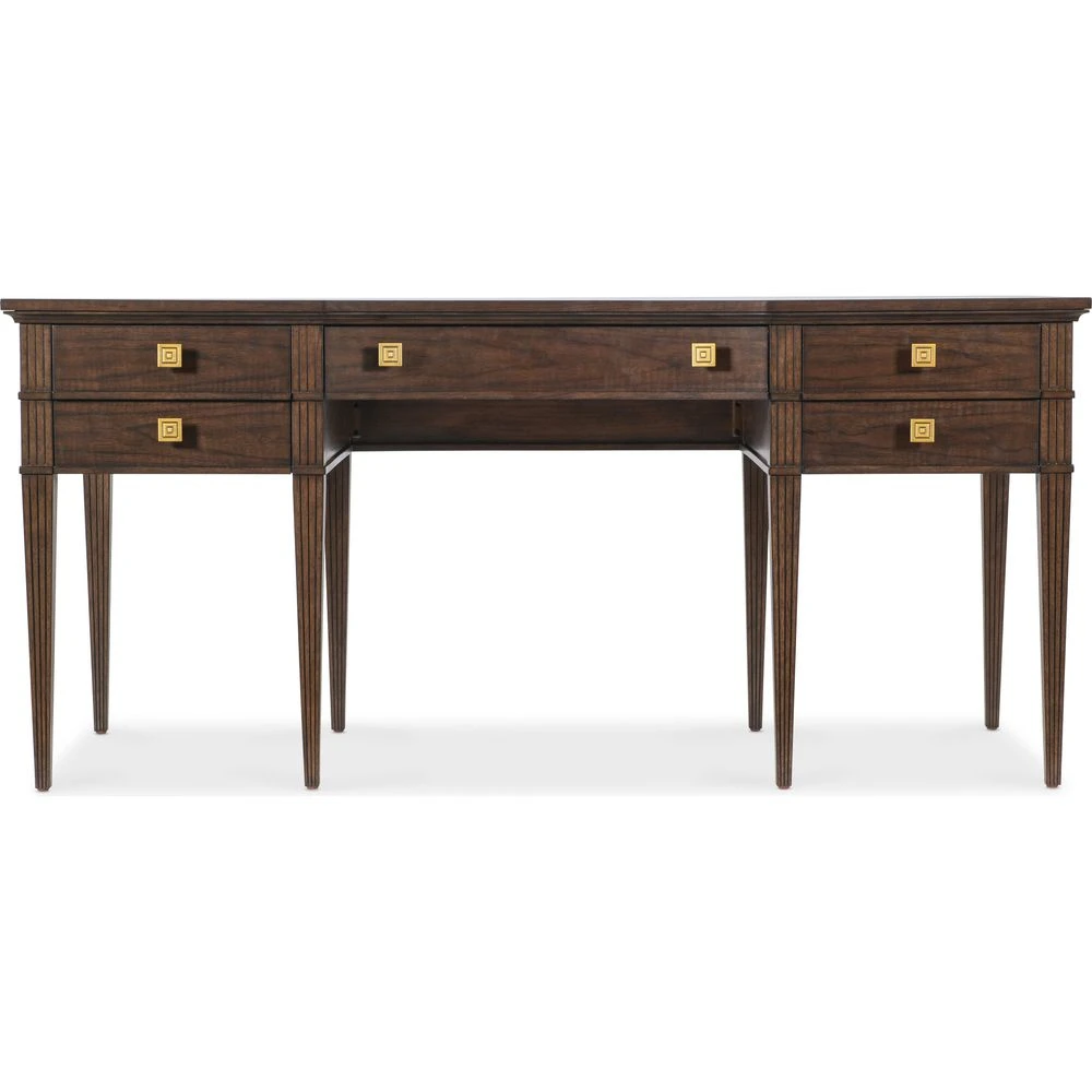 Description: A timeless European-inspired desk silhouette crafted of Figured Walnut Veneers is accented by transitional gold-colored square knobs to create a stylistically versatile piece. Featuring carved tapered legs and accents, the five drawers include left and right top drawers with removable/interchangeable writing surface and pencil tray. Each of the top drawers has two removable partitions. The center drawer has a drop-front writing surface and wire management. Two bottom utility drawers.