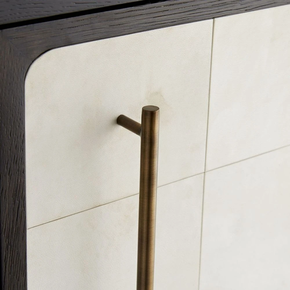 A study in architecture and design the Francesco delivers style and function. This deco-inspired cabinet features an antique brass steel base that showcases an ivory vellum-paneled façade framed by solid oak in an ebony finish. Linear handles finishedate this piece while rounded edges soften its quadrangle form. Its versatile aesthetic easily blends into any style decor. Use as a bar cabinet to stylishly store spirits or as a contemporary solution for concealing collectibles. Finish will vary.