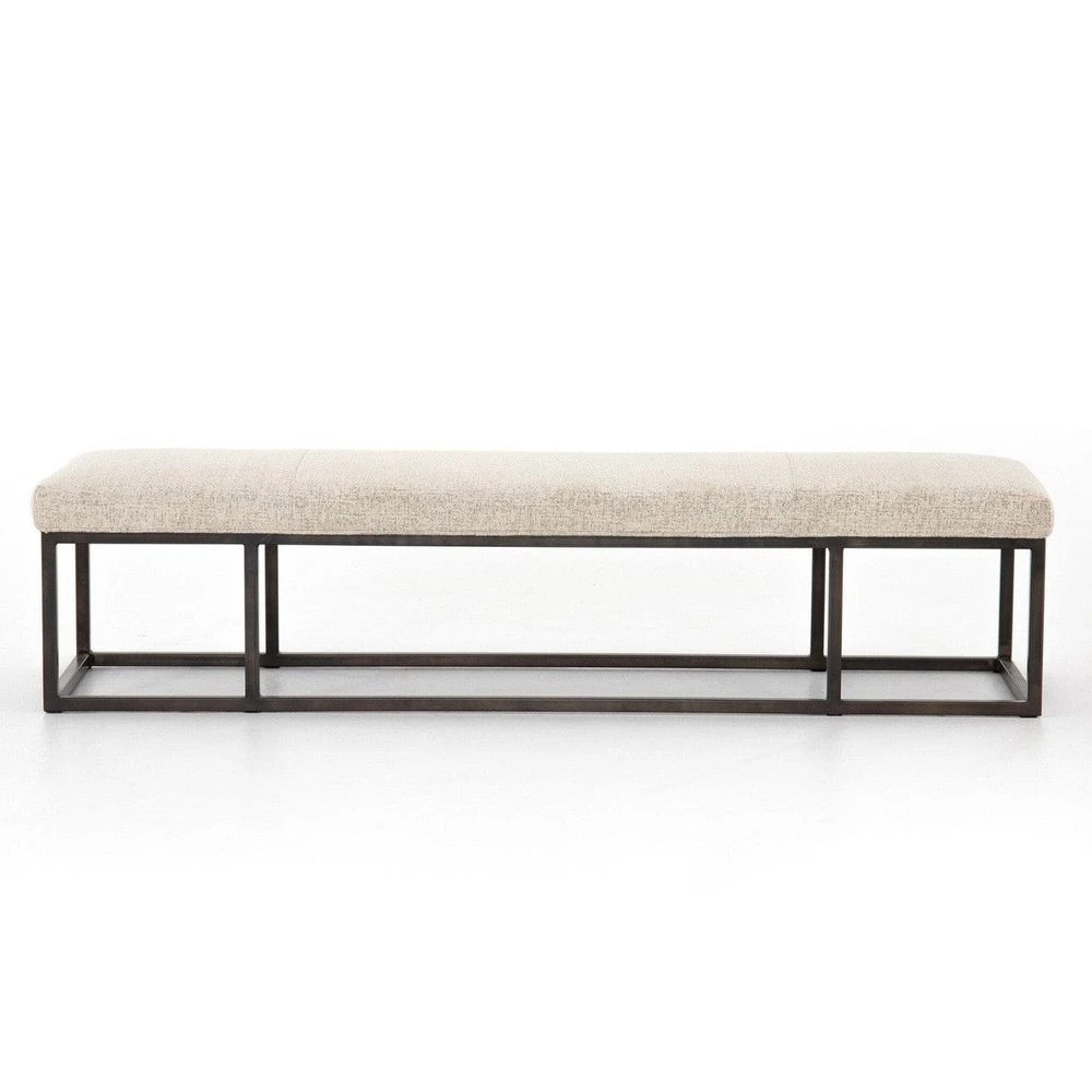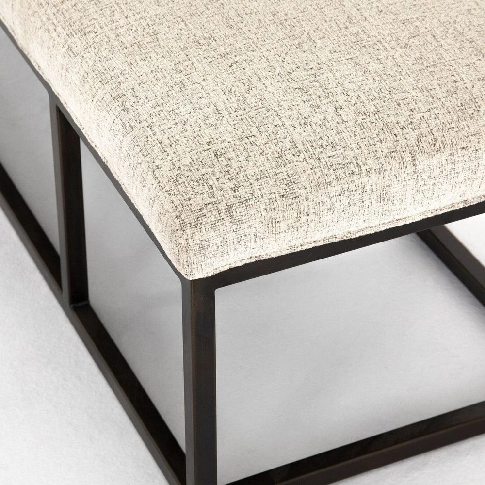 - Description: Streamlined shaping, textural to the touch. Gunmetal-finished iron framing stands slim and structured to support a well-tailored top of plush, linen-like upholstery. Open, adaptable styling allows for versatile placement options.