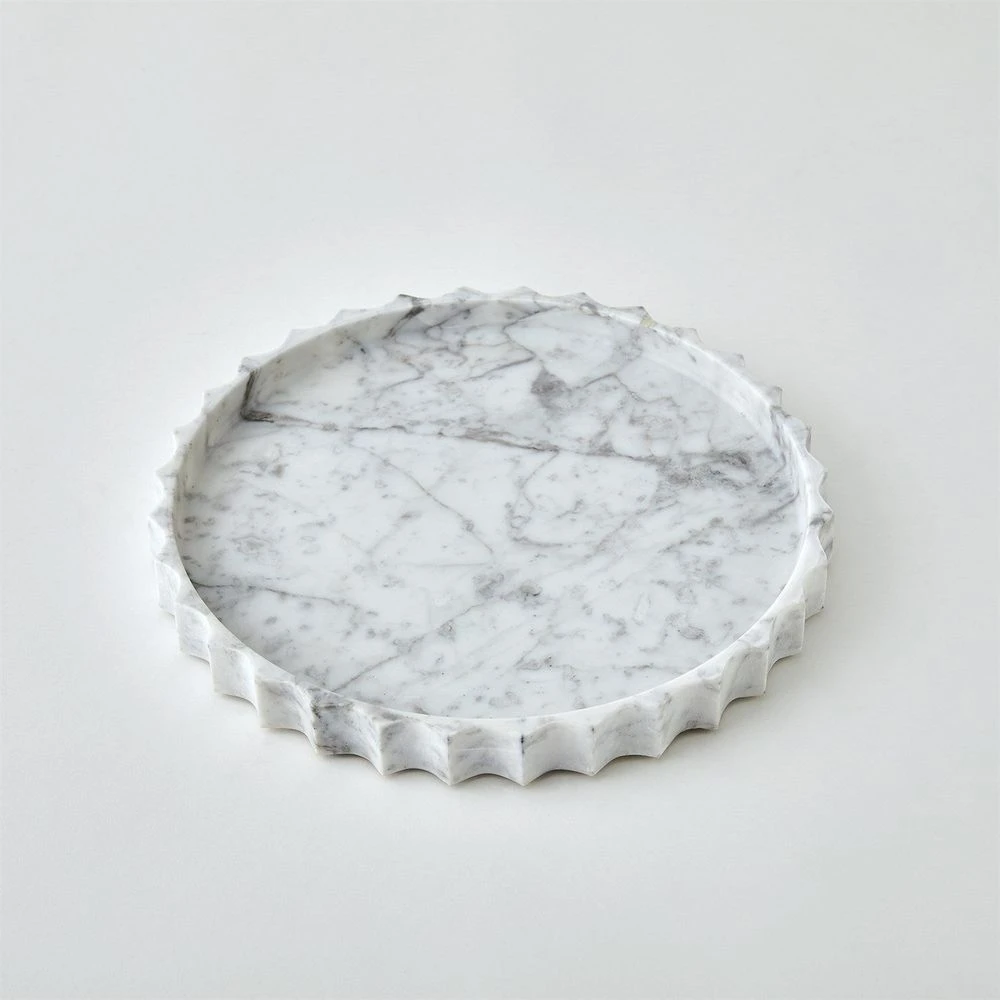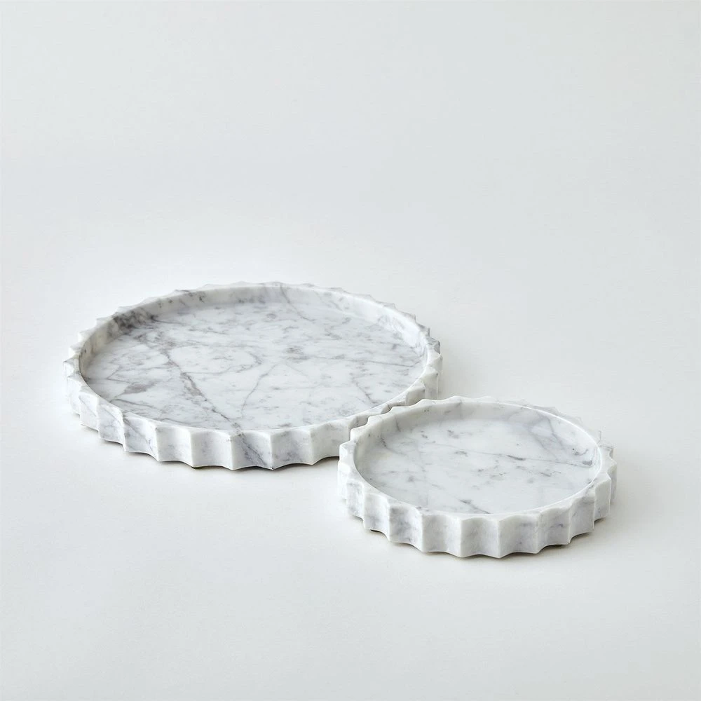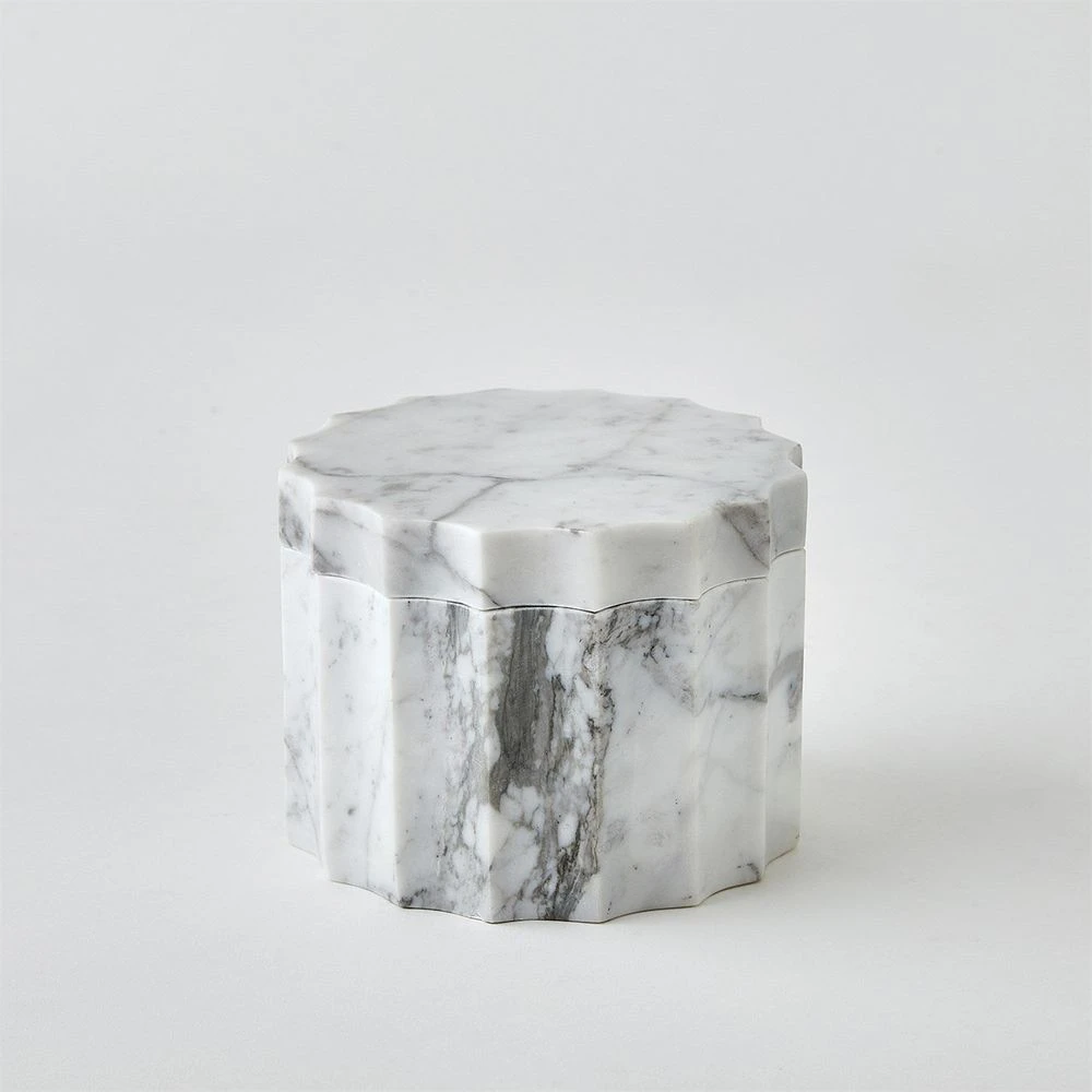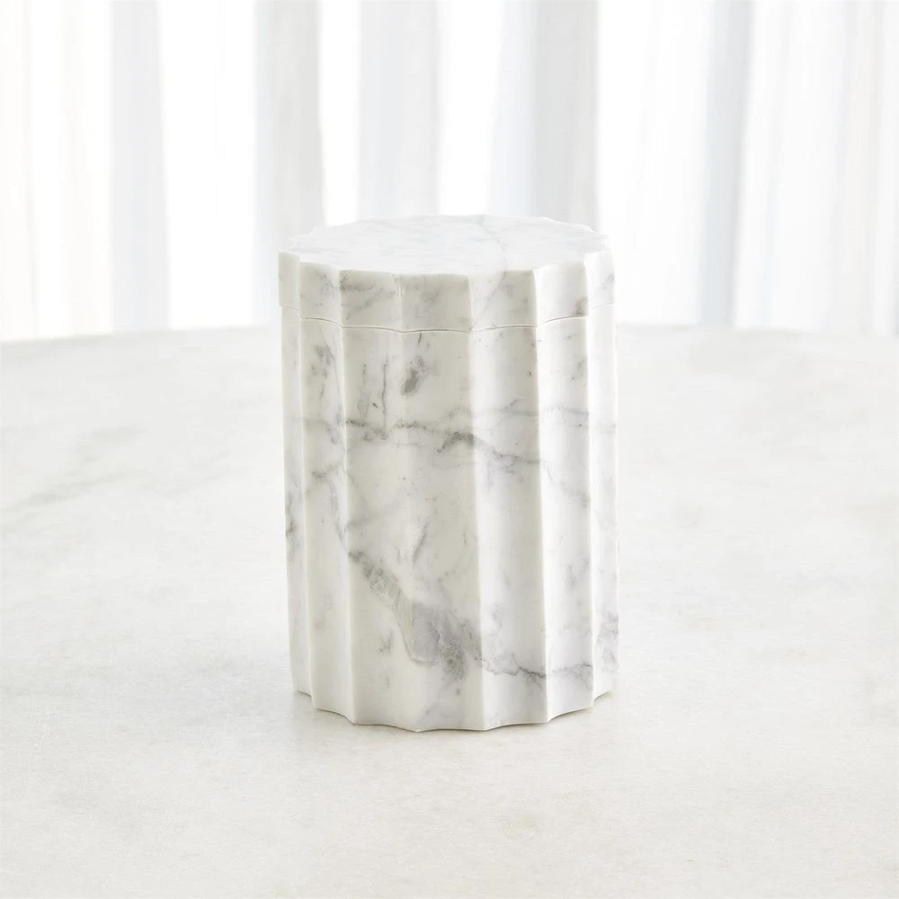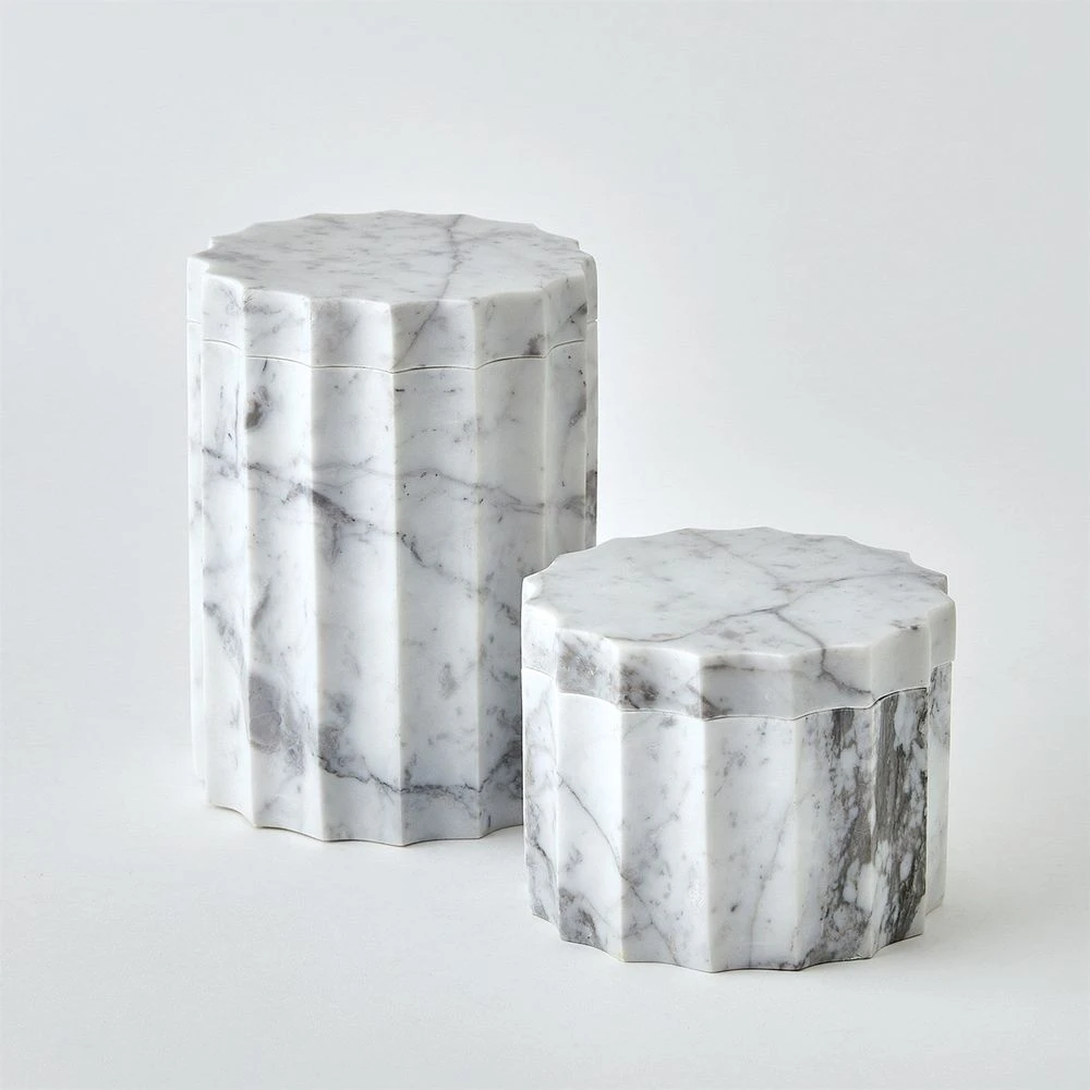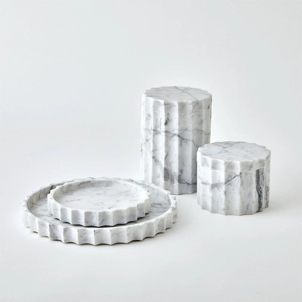 Description: Elevate your decor with the Ionic Jars and Trays, showcasing a sophisticated fluted design in exquisite carrara grey white marble from northern Italy. Renowned for its striking grey white backdrop and rich dark grey veining, each piece is a unique creation, celebrating the natural variations that make marble truly special.