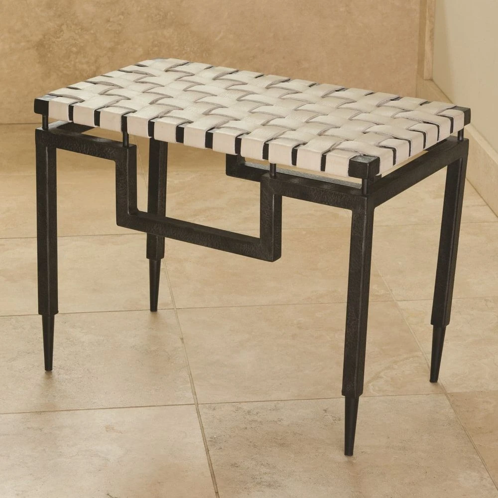 This bench is made of hand wrought, hammered iron with a black powder coated finish. Top is made of ivory belt woven leather.