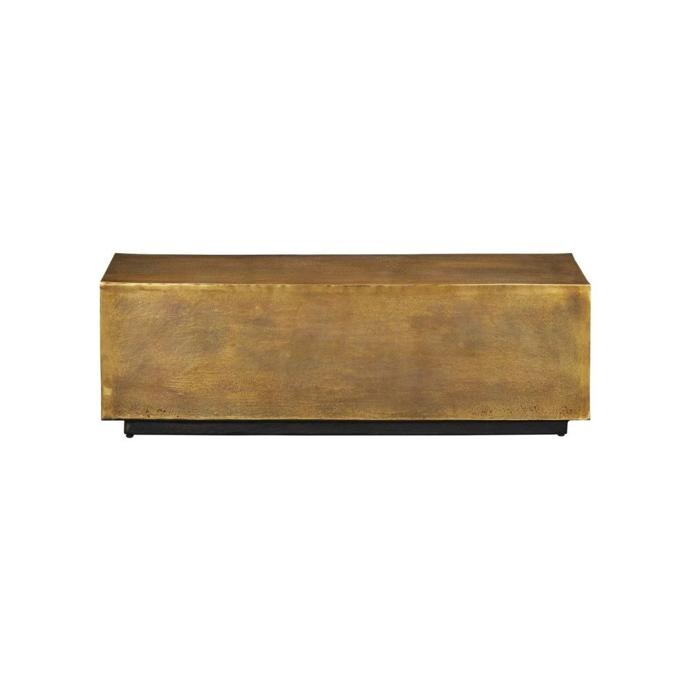 Description: Proving that texture works well on a contemporary piece of furniture, the Jahnu Bench has a surface that is swirling with personable tonal variations and stippling. The gold bench is composed of a cast aluminum rectangle that sits atop a black plinth base, which is also made of aluminum. Though the lines of this piece are thoroughly modern, the metal bench would also shine in a setting with industrial stylistic notes.