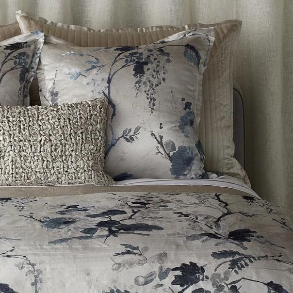 Jardin Fleur is a fresh and modern take on a traditional pattern. The duvet cover features a gorgeous floral jacquard woven in cool shades of azure and neutrals. The flowers are set against a silver background that allows them to pop.