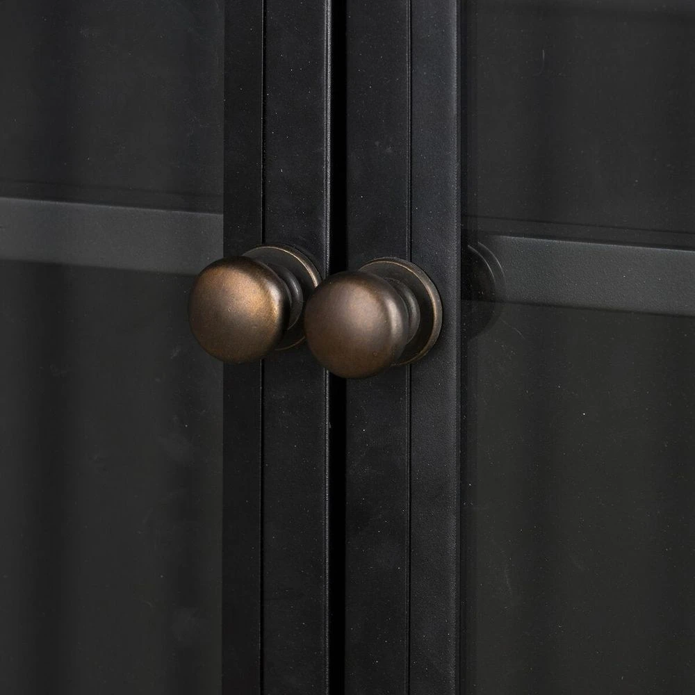 Showcase meets storage in beautifully arched cabinetry of black-finished iron and tempered glass, finished off with simple bronzed hardware.