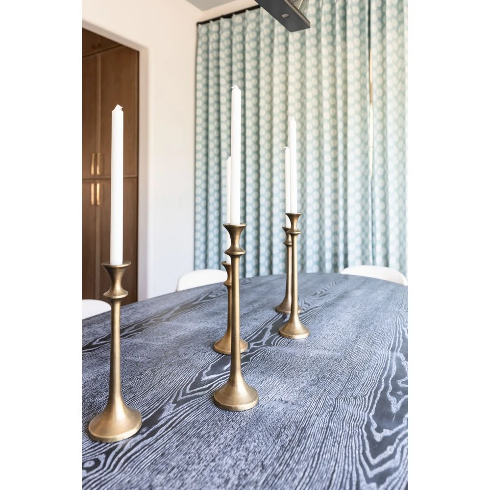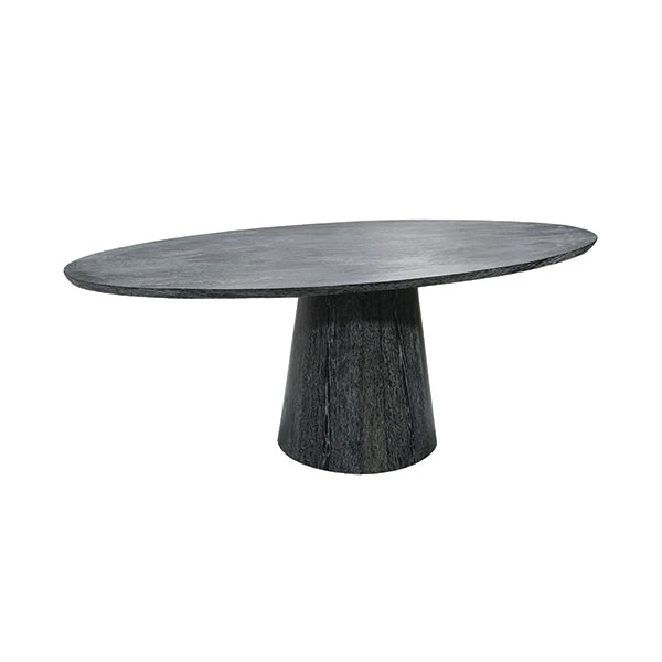 Description: Our Jefferson oval dining table makes the most of its classic, minimalist silhouette. The tapered wood base has a stately presence, and black cerused finish amplifies its natural, textured oak grain. With an 86-inch wide, reverse-beveled top, the Jefferson comfortably seats six to eight guests.