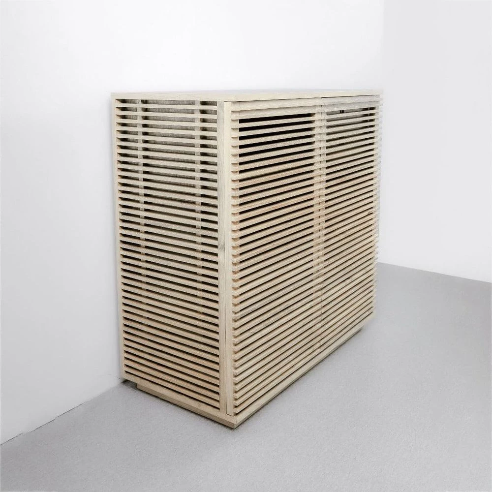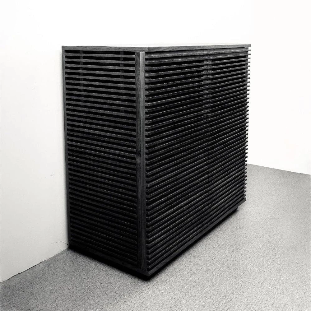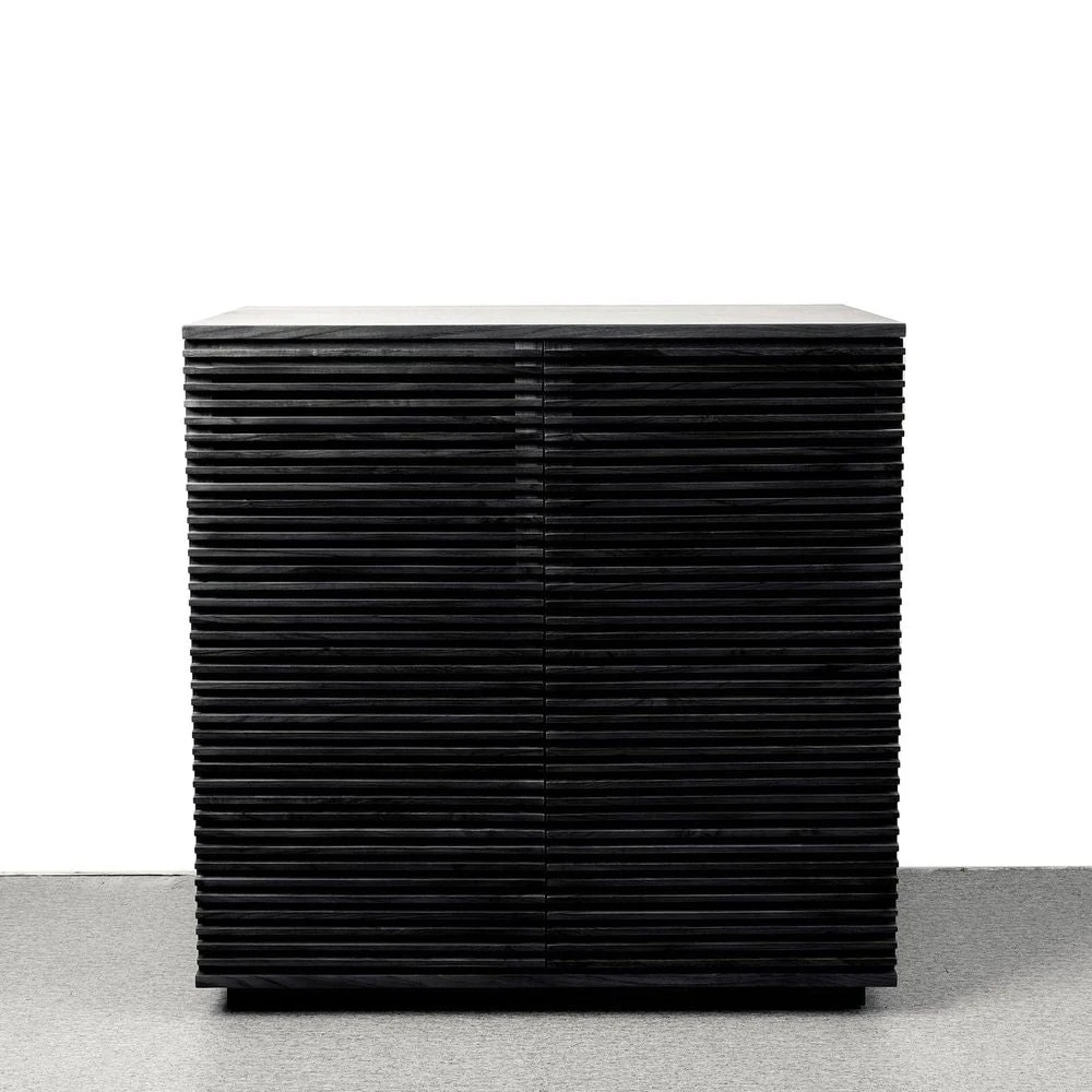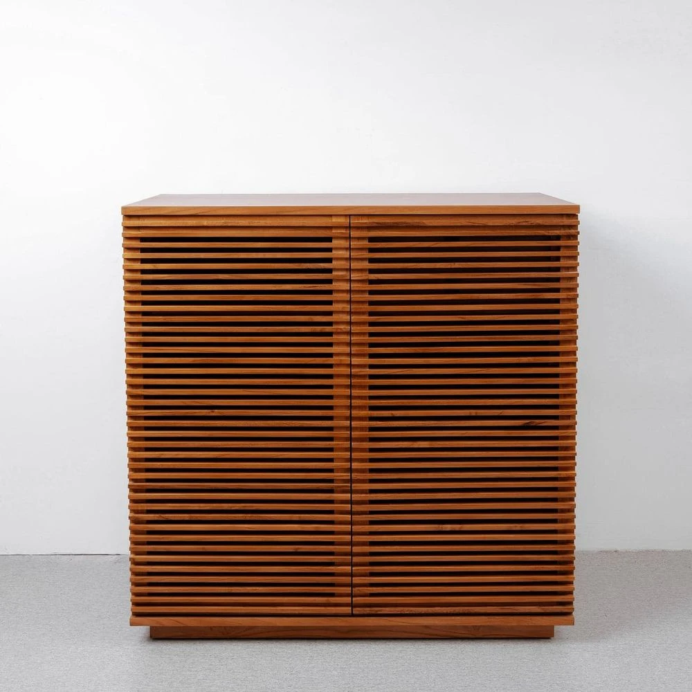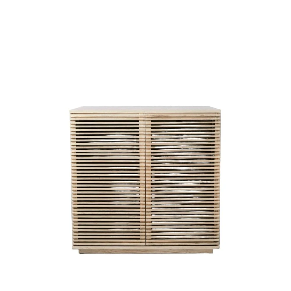 This handsome slatted bar cabinet will fill your space with visual interest as well as adding valuable bar storage for all of your entertaining needs. Teak wood slats surround this piece on three sides giving it its unique look. Shelving inside the cabinet will help you organize wine bottles, liquor, and much more. Available in natural, black, or ivory.